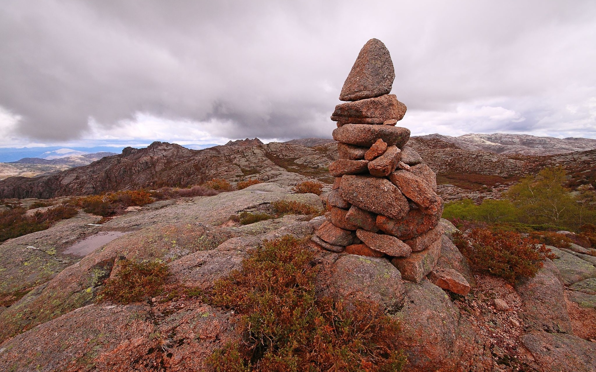 Description: A pile of rocks sitting on top of a rocky hillside under a cloudy sky with mountains in the background.