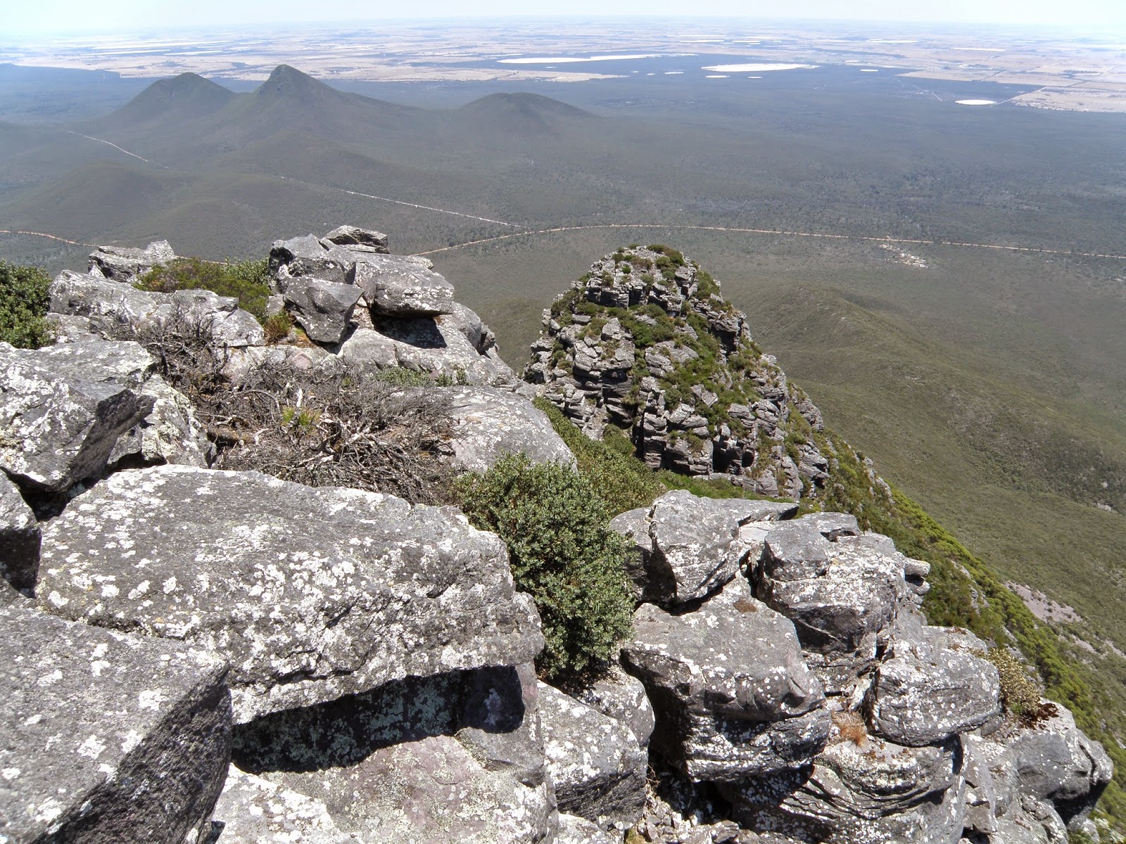 Description: A rocky mountain with a view of a valley and mountains in the distance with a rope running through it.
