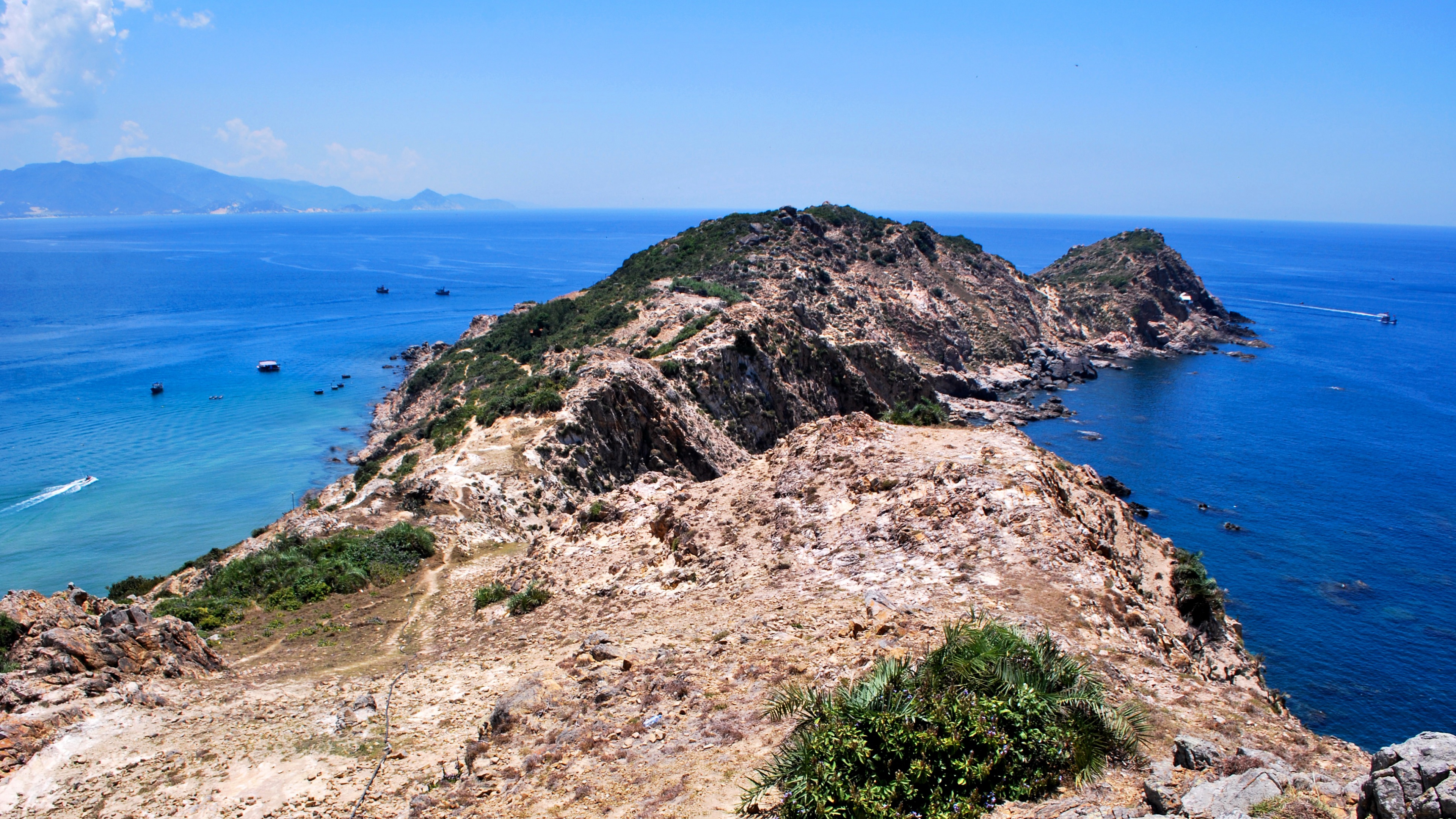 Description: A rocky mountain with a body of water in the background and a boat in the distance on the water.