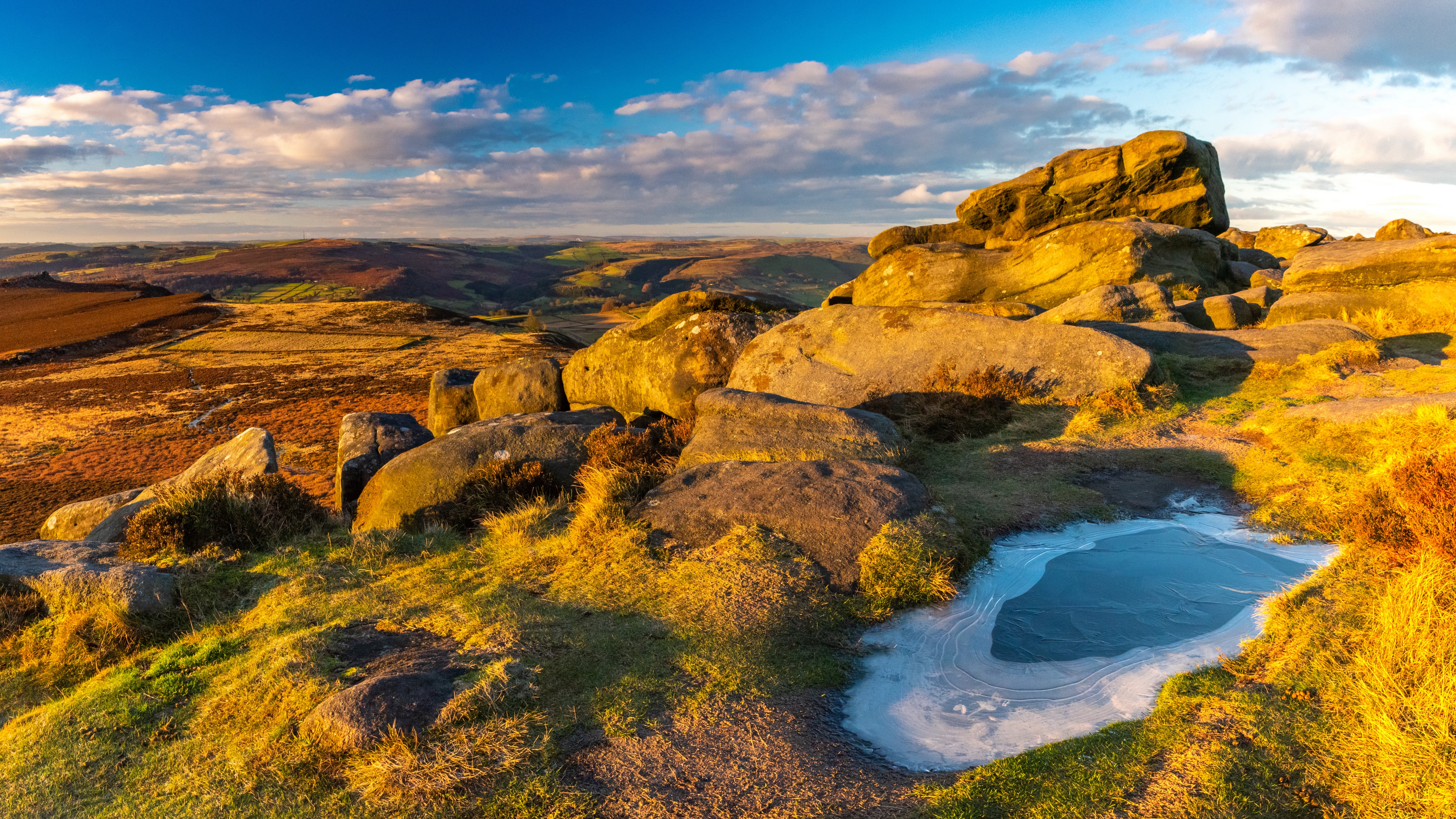 Description: A small pond in the middle of a rocky field with a sky background and clouds in the sky above.