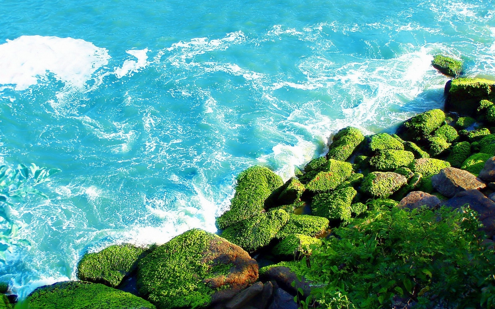 Description: A rocky shore with green moss growing on it and a body of water in the background with a wave coming in.
