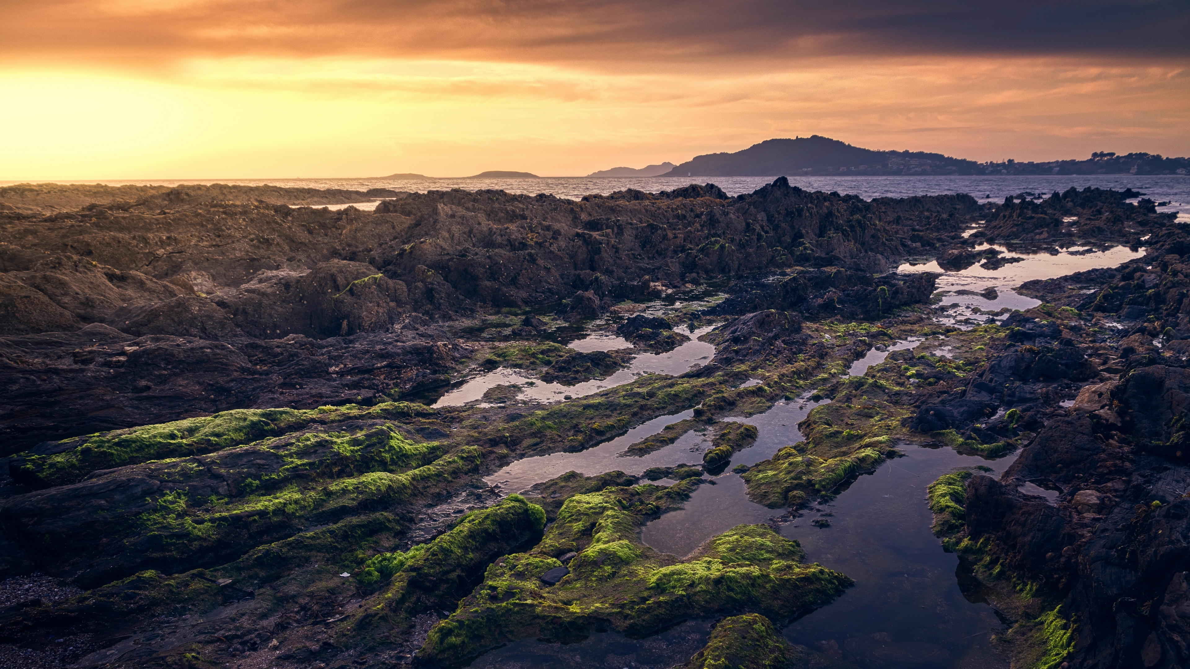Description: A rocky shore with a body of water and a small island in the distance with a sunset in the background.