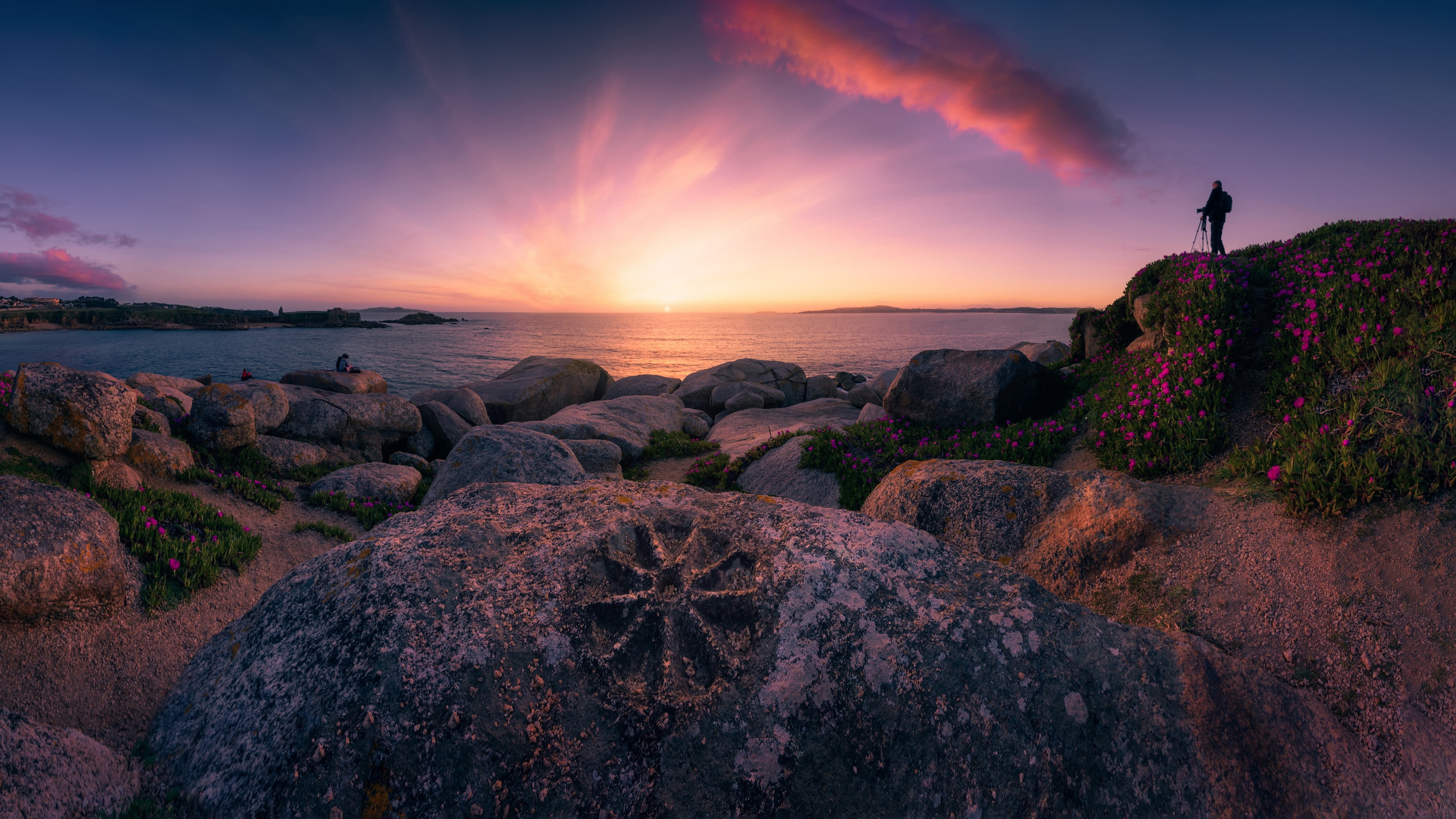 Description: A person standing on a rocky shore at sunset with a pink sky and clouds in the background and a pink and purple sky.