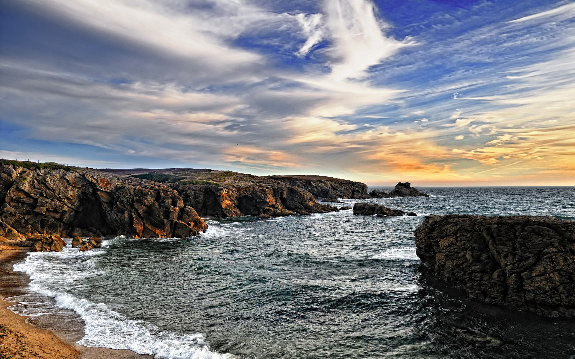 Description: A rocky shore with waves crashing on the shore and a sunset in the background with clouds in the sky.