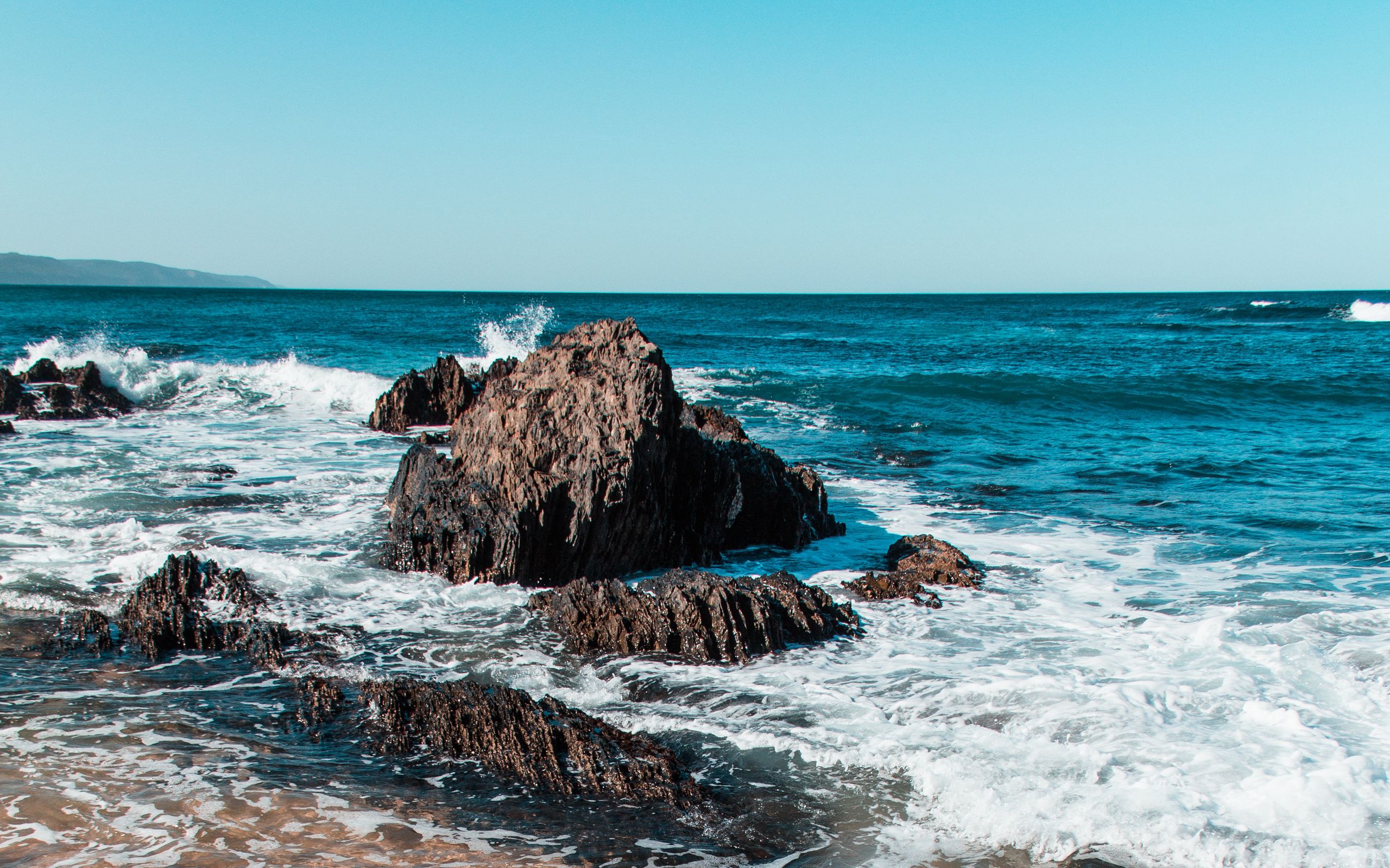 Description: A rocky shore with waves crashing on it and a boat in the distance in the distance.