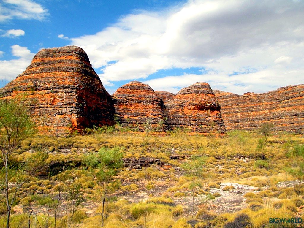 Description: A rocky outcropping with a few trees in the foreground and a blue sky with clouds.