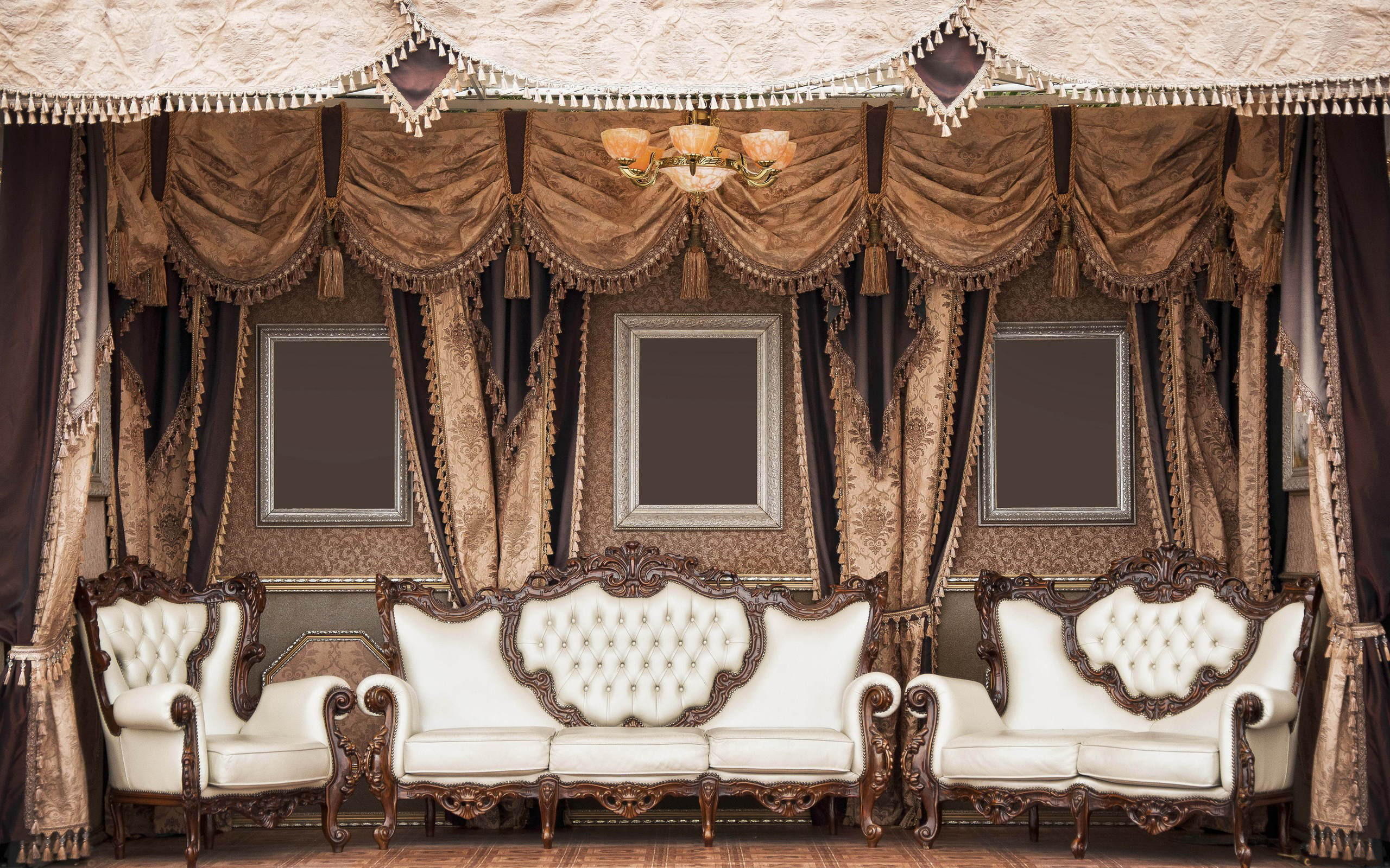 Description: A room with a canopy and a couch and chairs in it with curtains on the sides of the room.