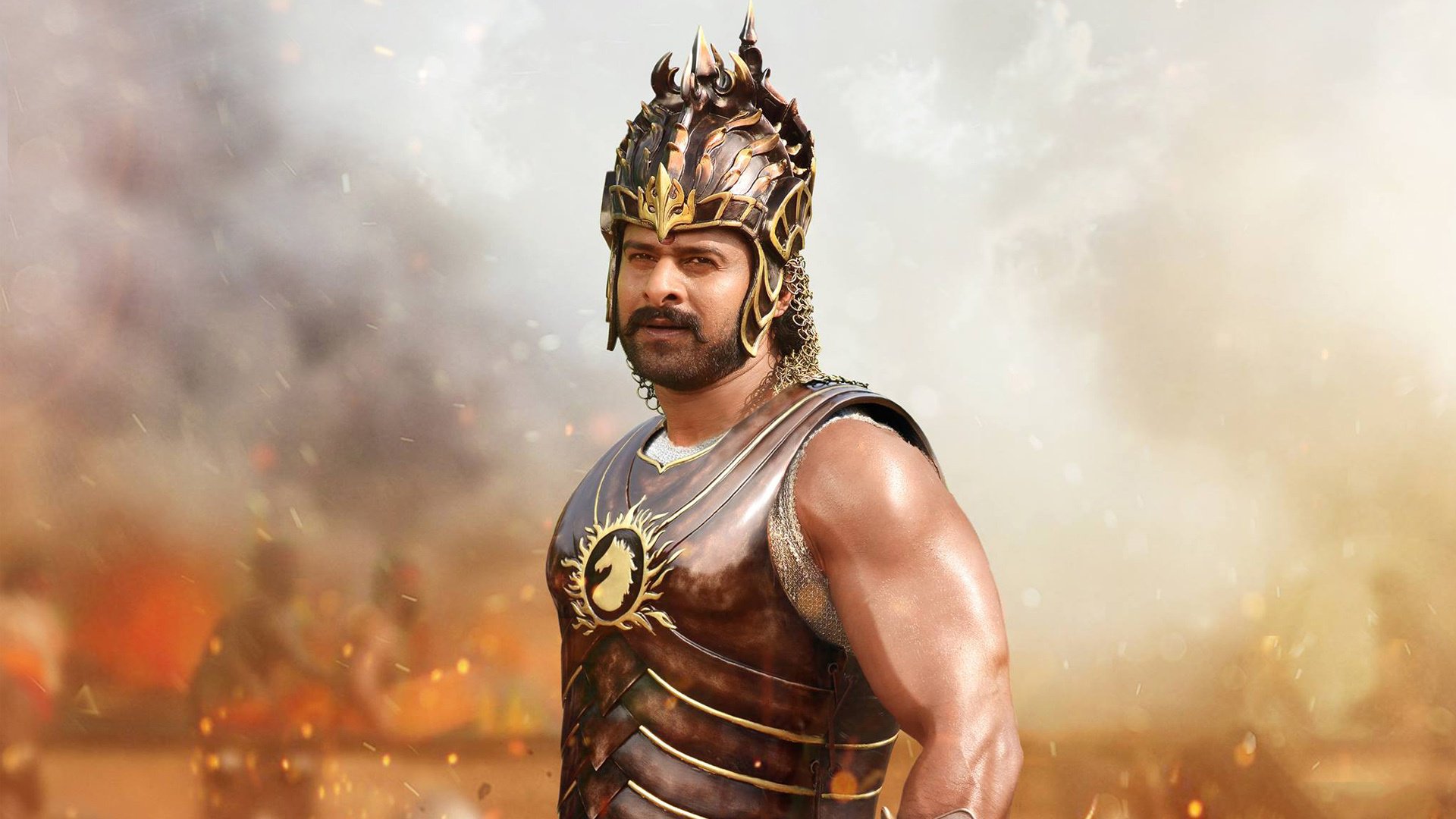 Description: A man in a roman gladia costume standing in front of a fire filled sky with smoke and flames.