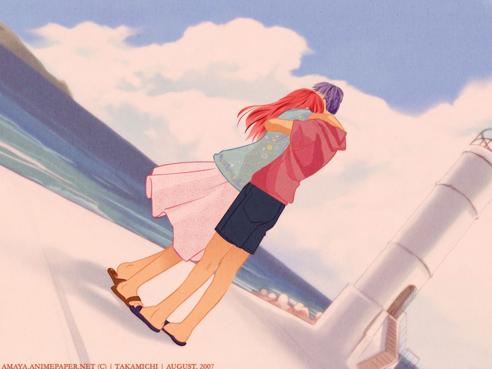 Description: A couple of people that are standing on a boat together in the water with a sky background and clouds.