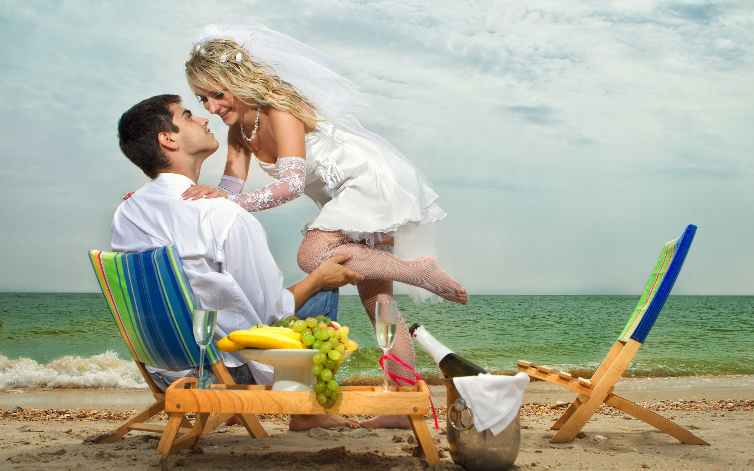 Description: A man and woman sitting on a beach chair with a bunch of fruit on it and a bowl of fruit in front of them.