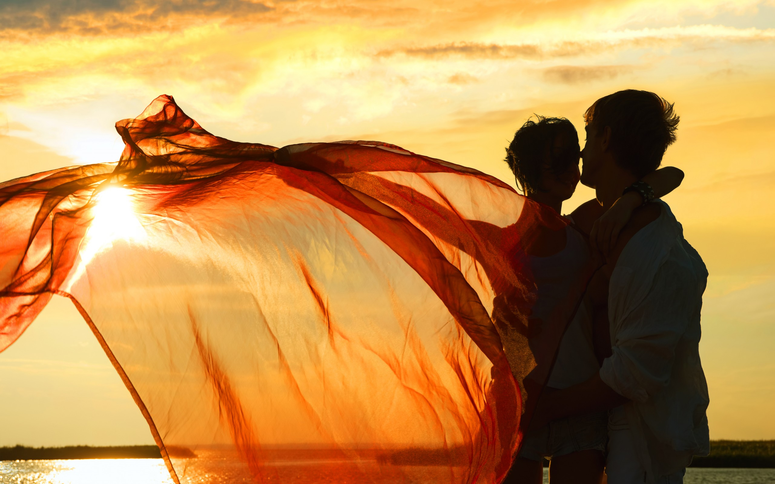 Description: A couple of people that are standing near the water with a red cloth over them and a sunset behind them.
