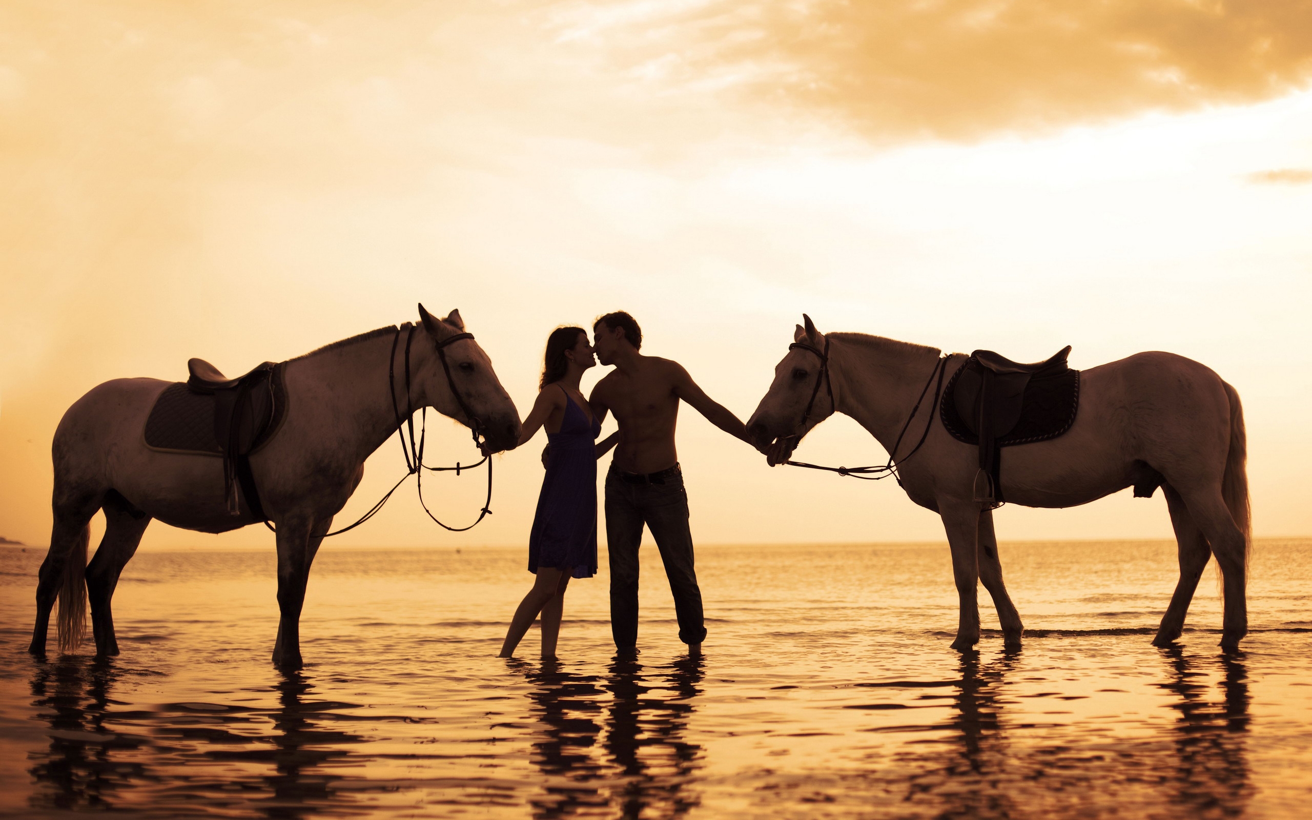 Description: A couple of people standing next to two horses on a beach at sunset with a sky background and water.