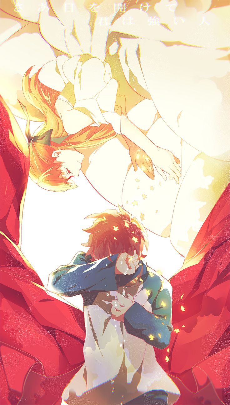 Description: A man and woman hugging in front of a red background with a sun shining behind them and a red cloth covering them.
