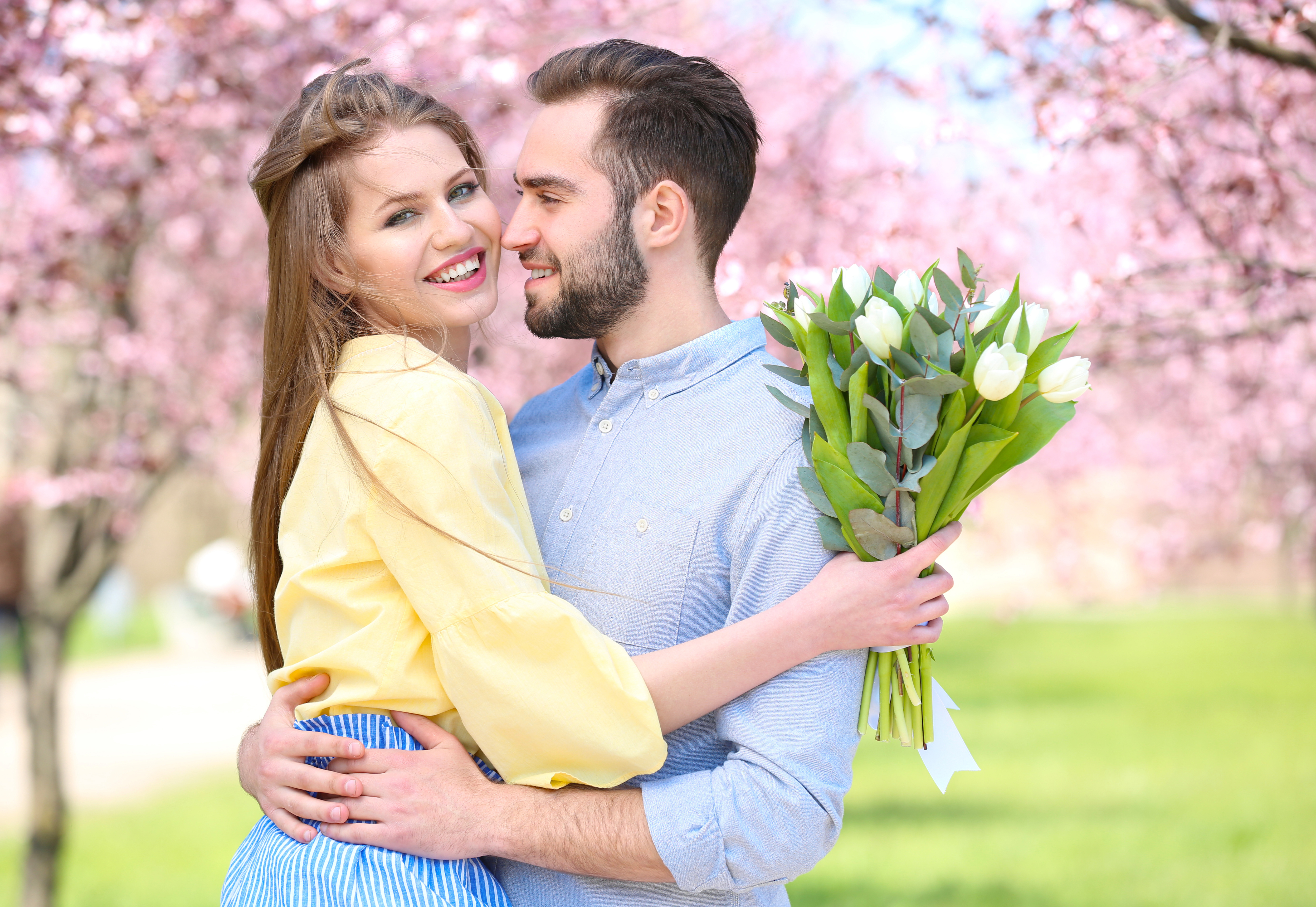 Description: A man and woman are hugging under a tree with pink flowers on it and one is holding a bouquet of flowers.