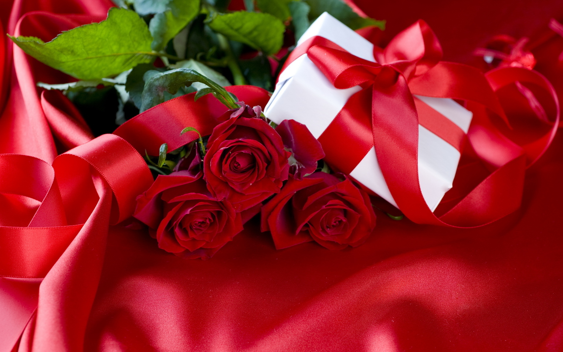 Description: A bouquet of roses and a gift box on a red satin background with a bow and ribbon around it.