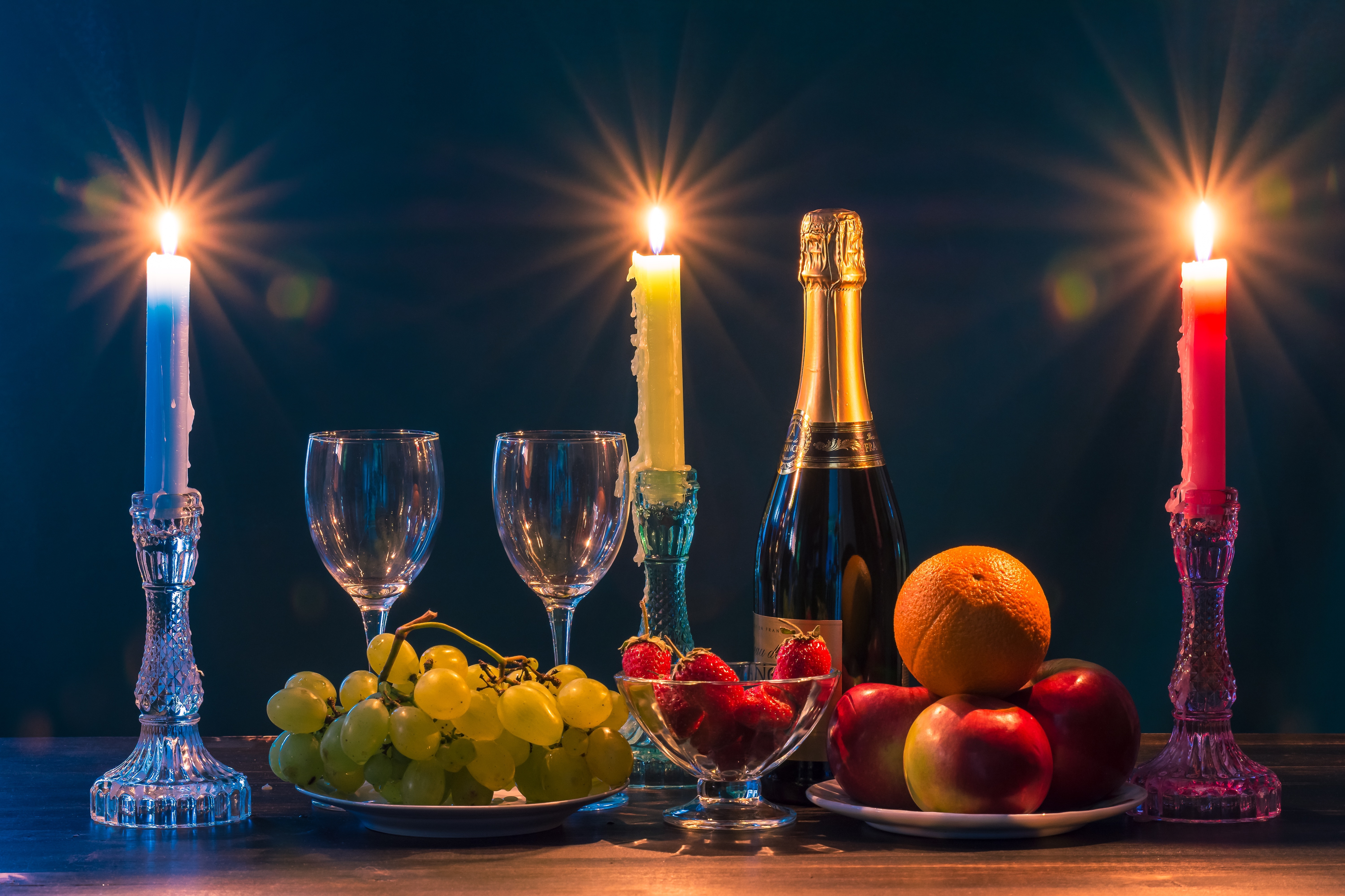 Description: A table topped with a plate of fruit and a bottle of wine next to a candle and a plate of fruit.