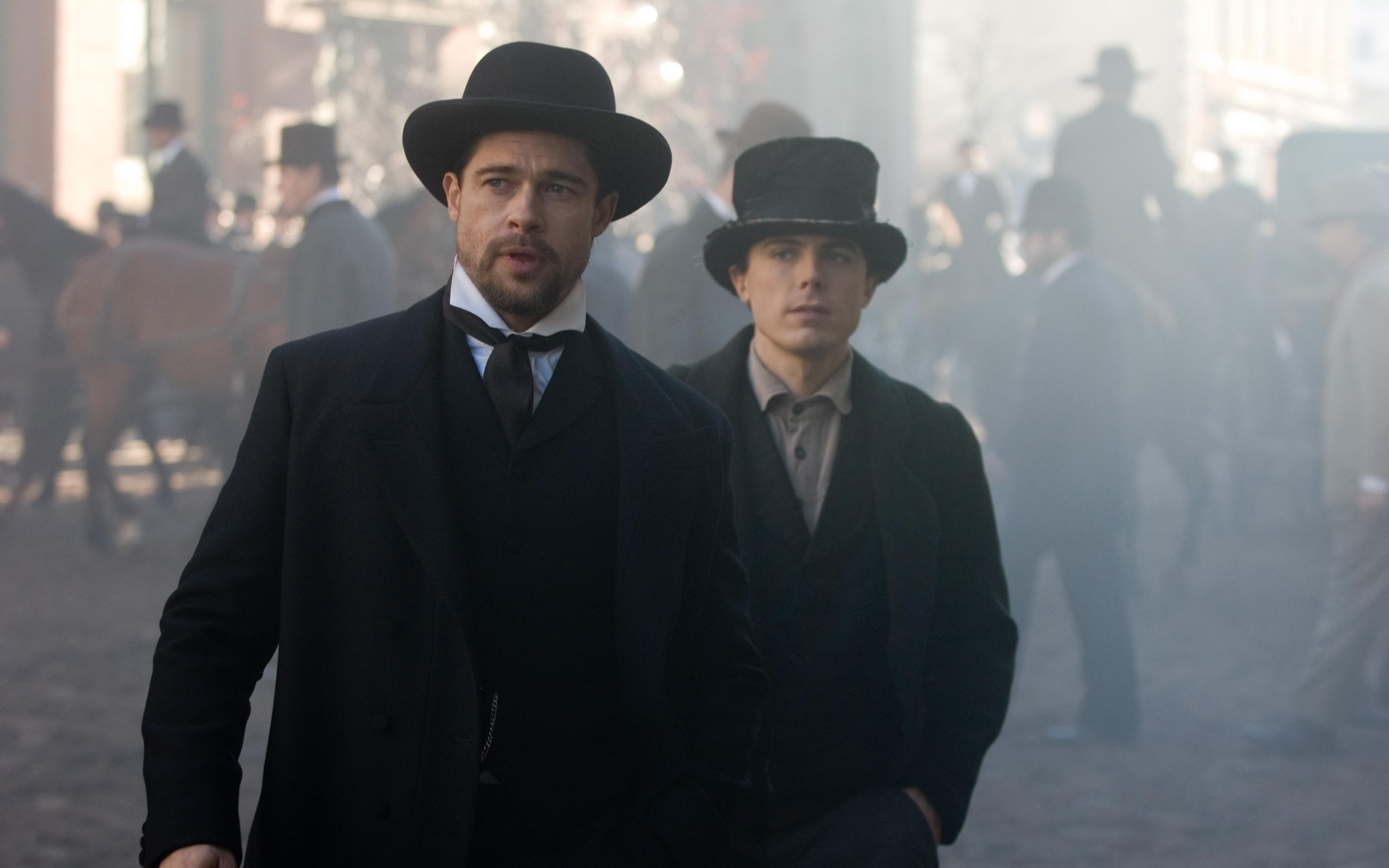 Description: Two men in hats and suits walking down a street with horses in the background and a crowd of people in the background.