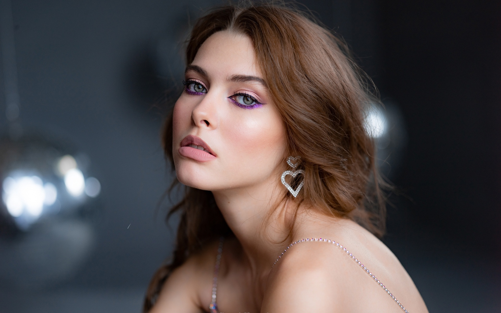 Description: A woman with a necklace and earrings on her neck posing for a picture in a mirror with a disco ball in the background.