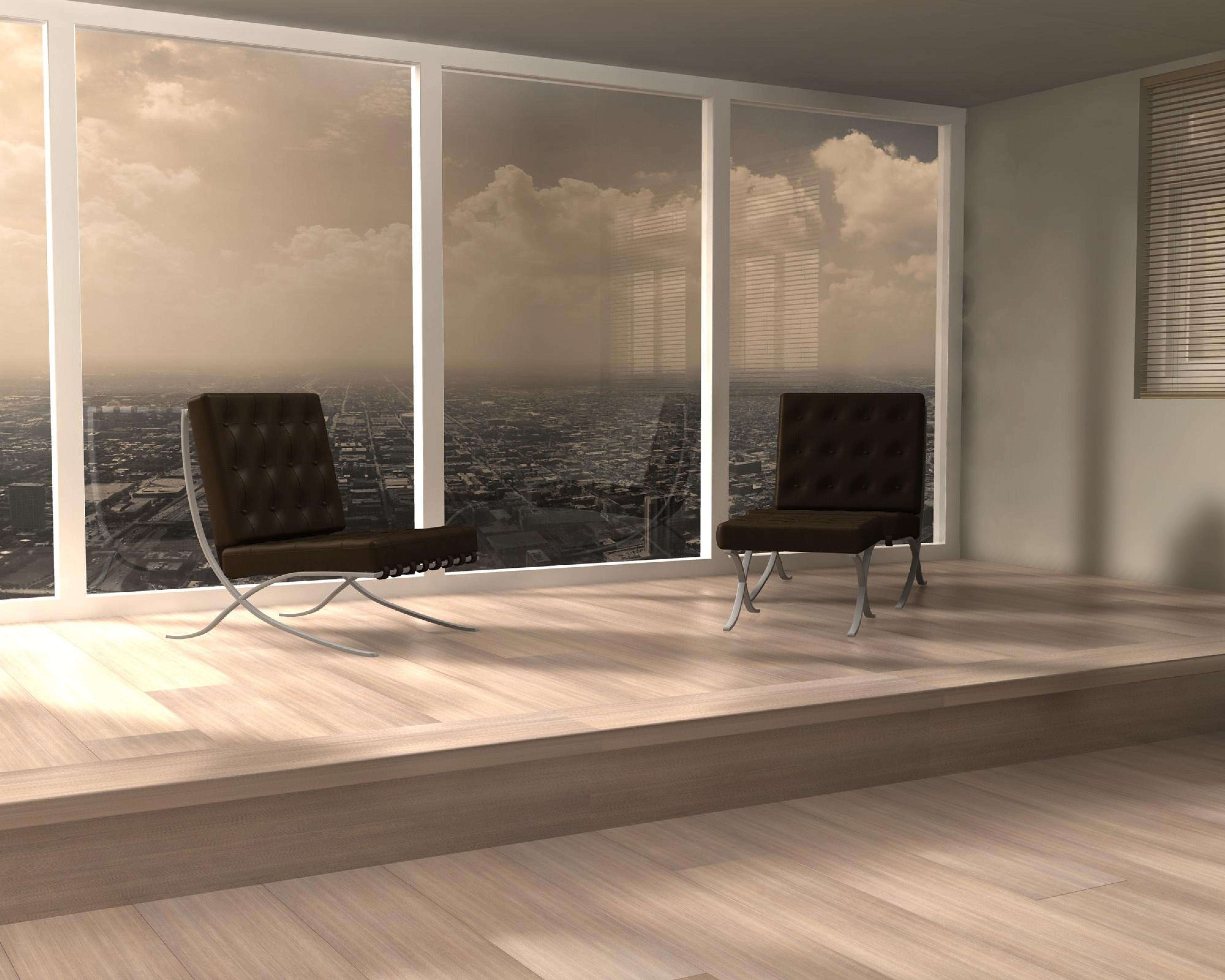 Description: A room with a chair and a window with a view of the city outside it and a chair in the middle.
