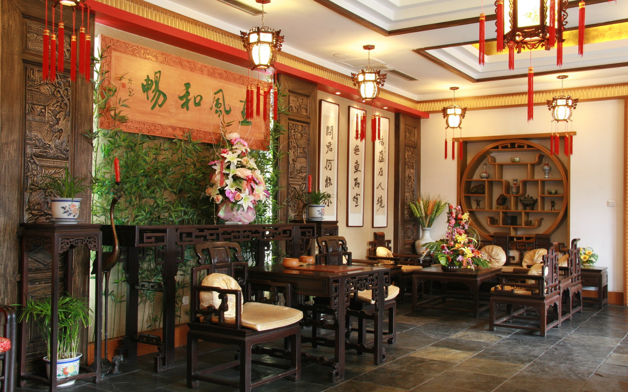 Description: A room with a lot of chairs and tables and a painting on the wall behind it and a vase with flowers.