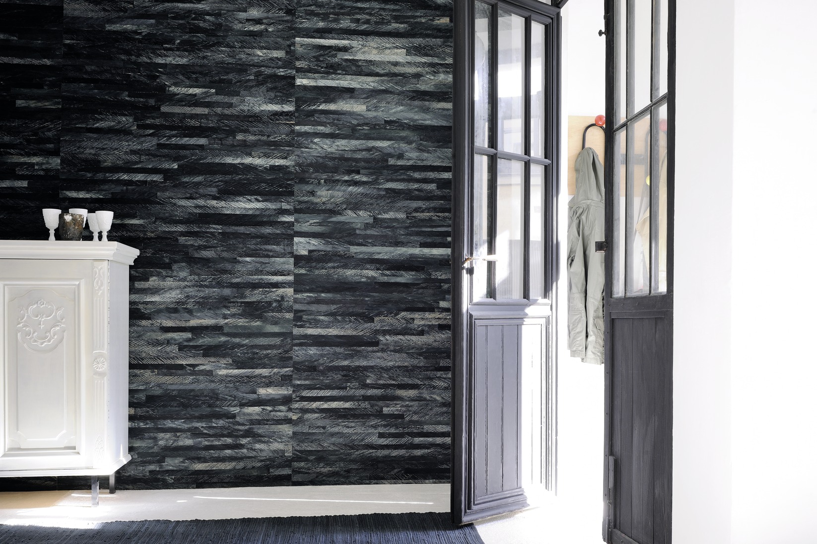 Description: A room with a door and a black and white wallpapered wall and a white cabinet with a coat on it.