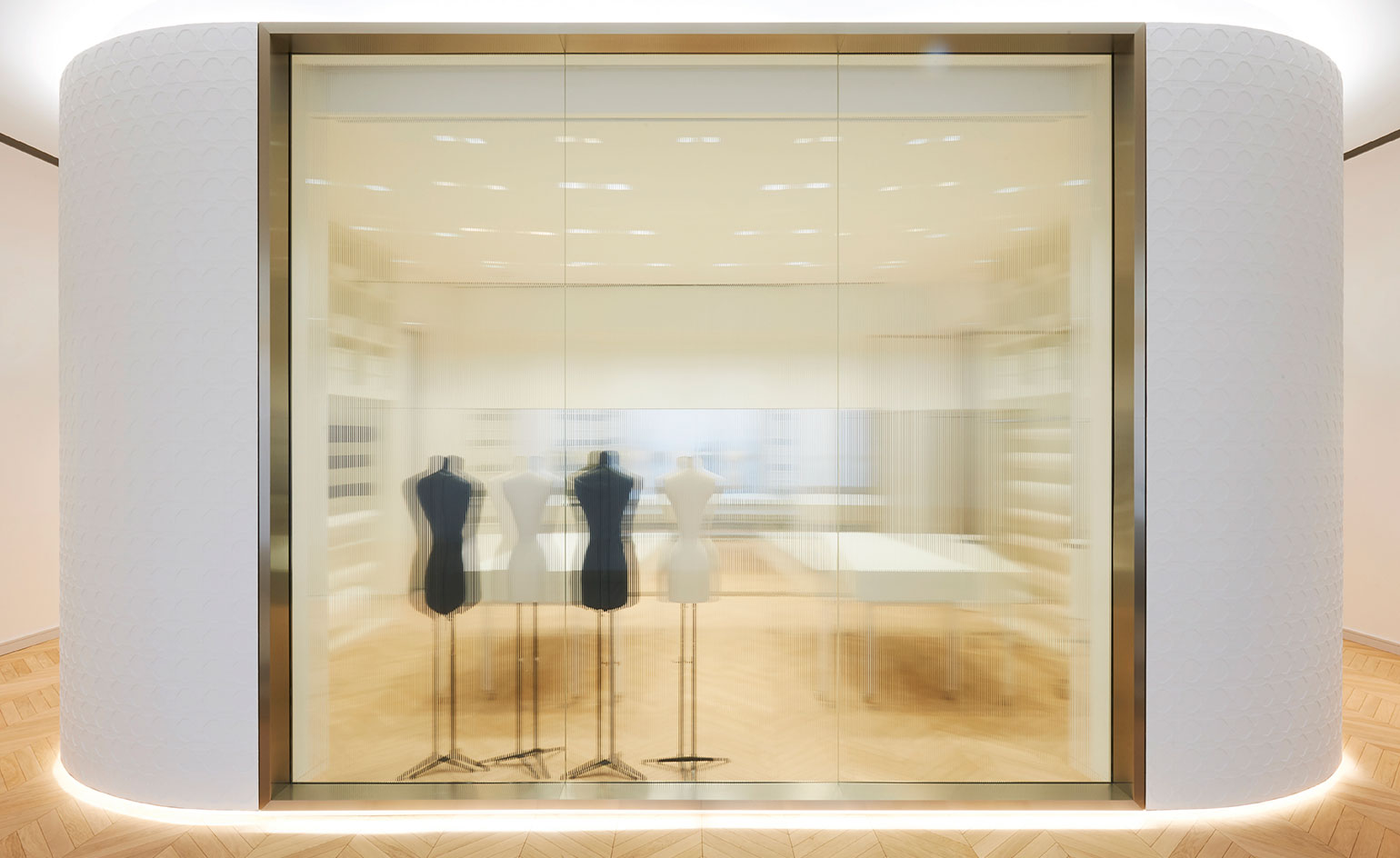 Description: A room with a glass wall and two mannequins in it and a window with a view of a bed.