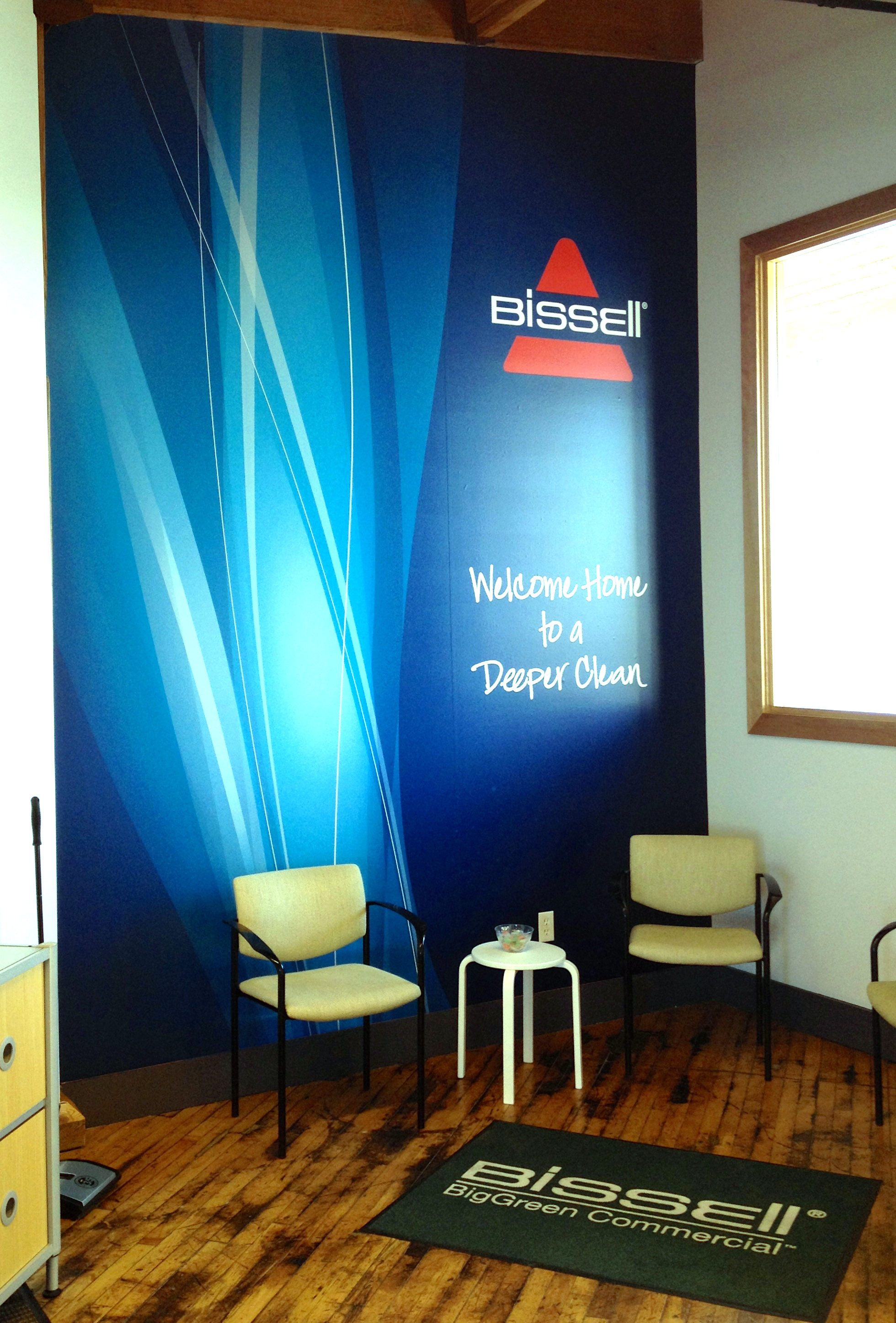 Description: A room with a sign and chairs in it and a rug on the floor in front of the wall.