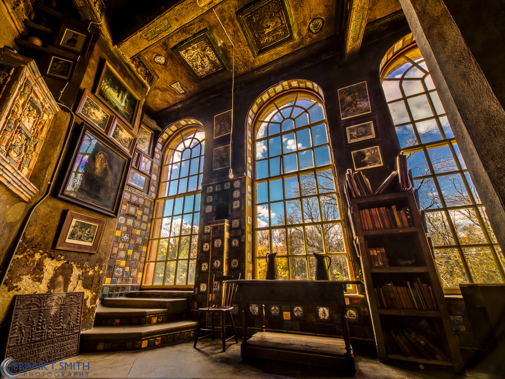 Description: A room with a lot of windows and a lot of books on the wall and a lot of pictures on the wall.