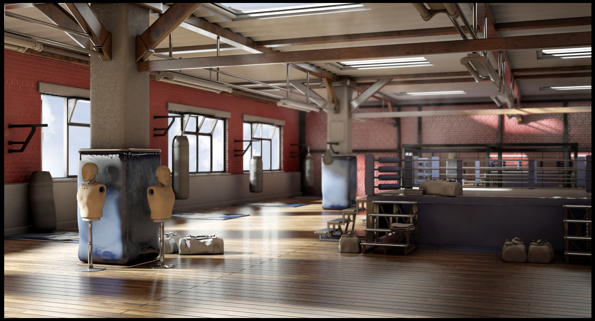 Description: A room with a lot of windows and a wooden floor with a sculpture on it and a few other objects.