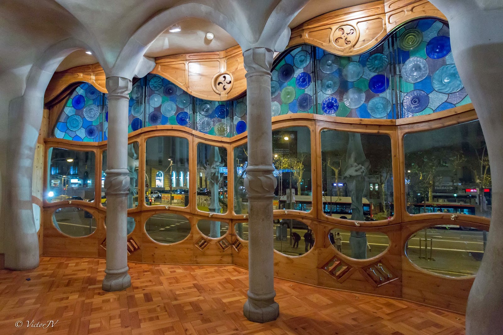 Description: A room with a lot of windows and a wooden floor with columns and a circular window with a blue and white design.