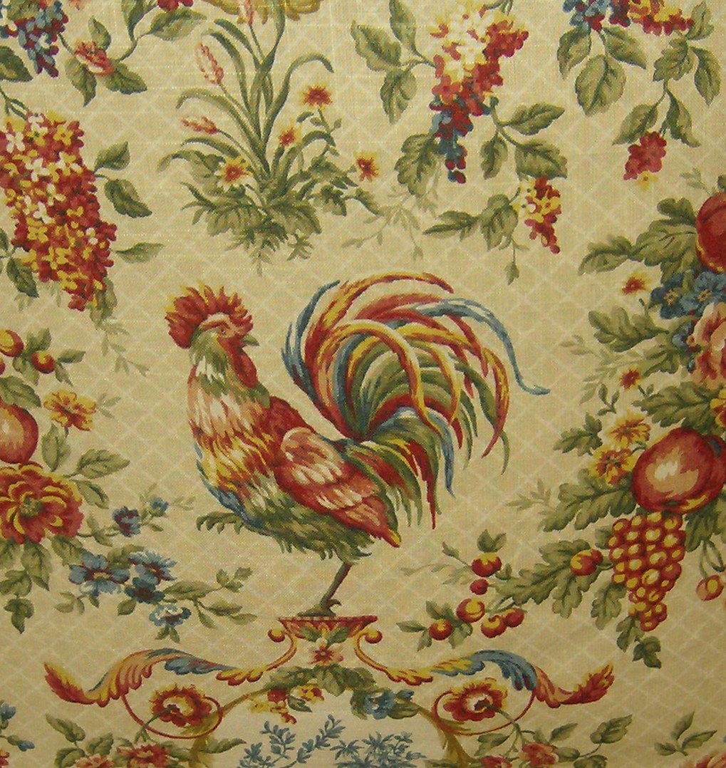 Description: A rooster and flowers on a white background with a red and yellow rooster on it's tail and a red and yellow rooster on its head.