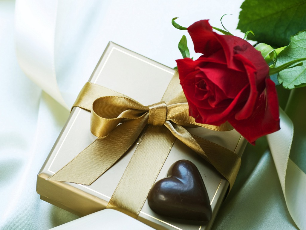 Description: A rose and two chocolate hearts in a gift box with a bow on a white cloth with a rose.