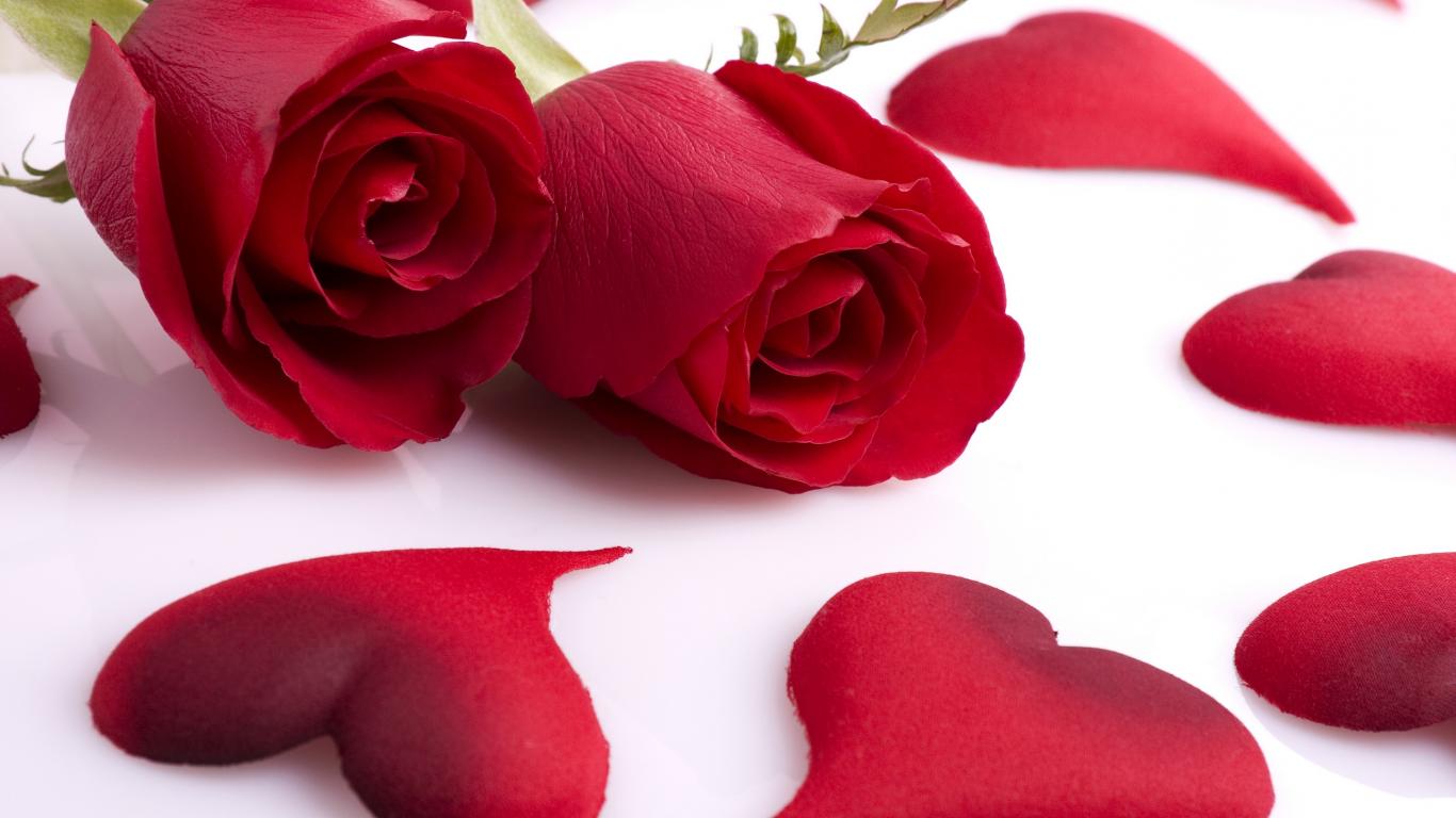 Description: A rose and two hearts on a white surface with petals scattered around it and a single rose on the floor.