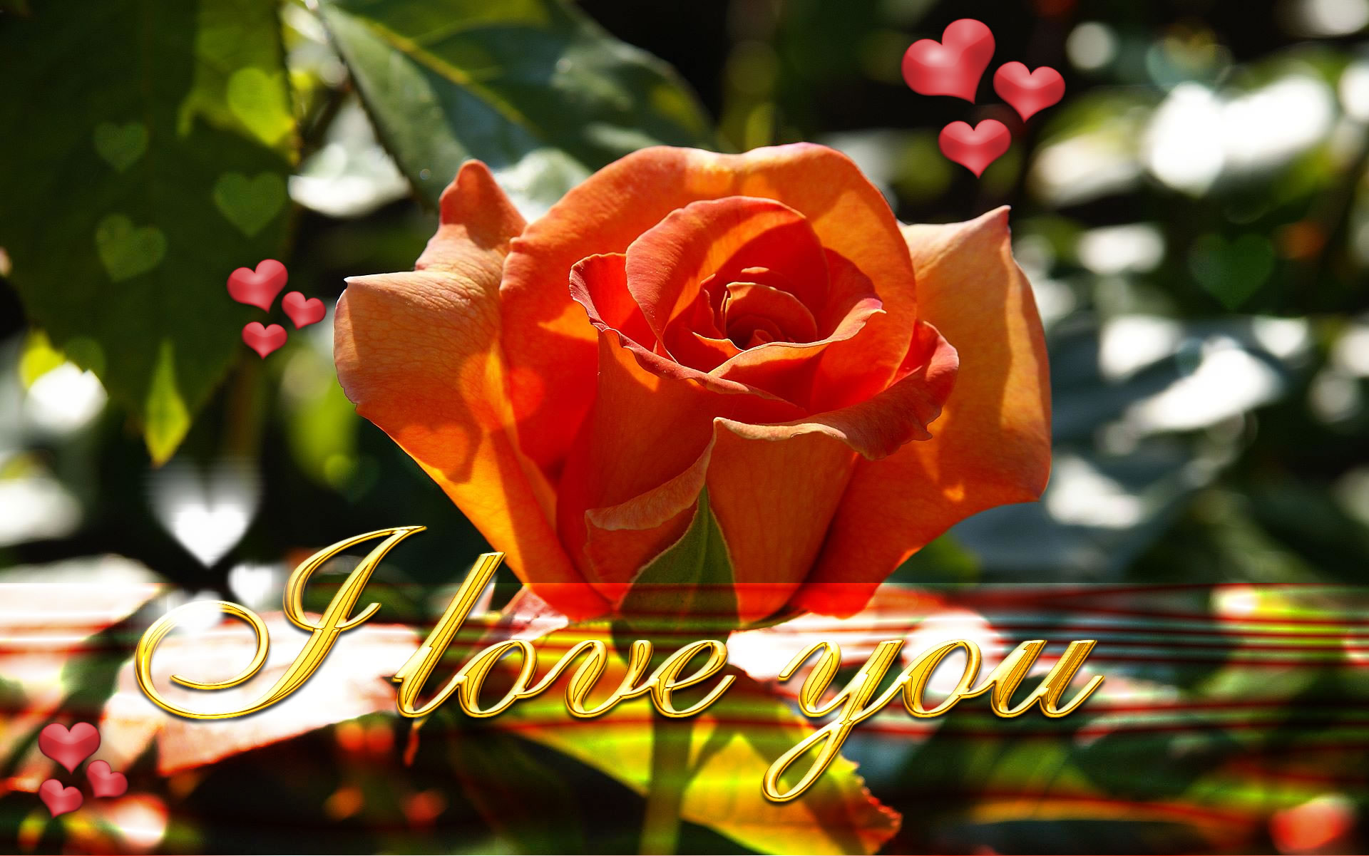 Description: A rose with a message that says i love you on it and hearts in the background with a green leaf.
