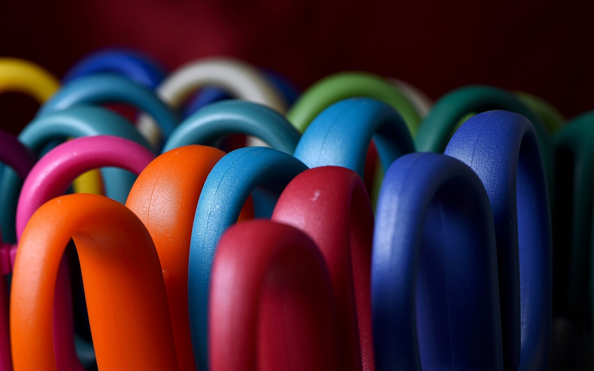Description: A bunch of different colored rubber rings in a row on a table with a red background and a red wall.