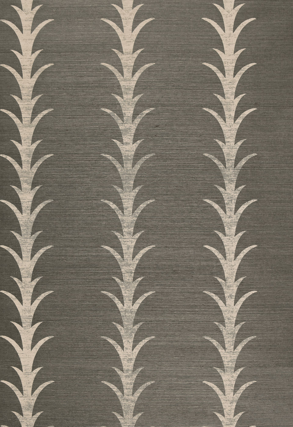 Description: A rug with a pattern of white and grey leaves on a gray background with a white border in the middle.