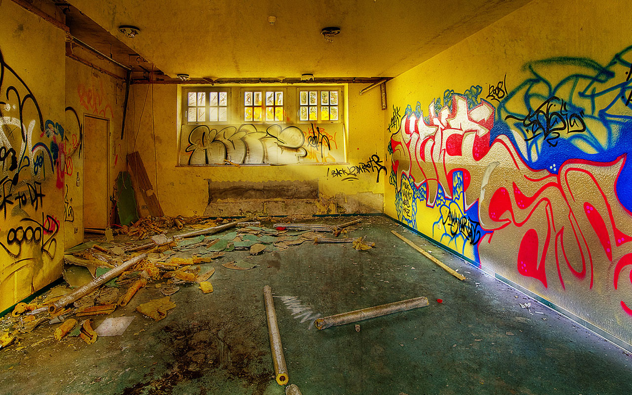Description: A run down building with graffiti all over the walls and flooring and a window in the center of the room.