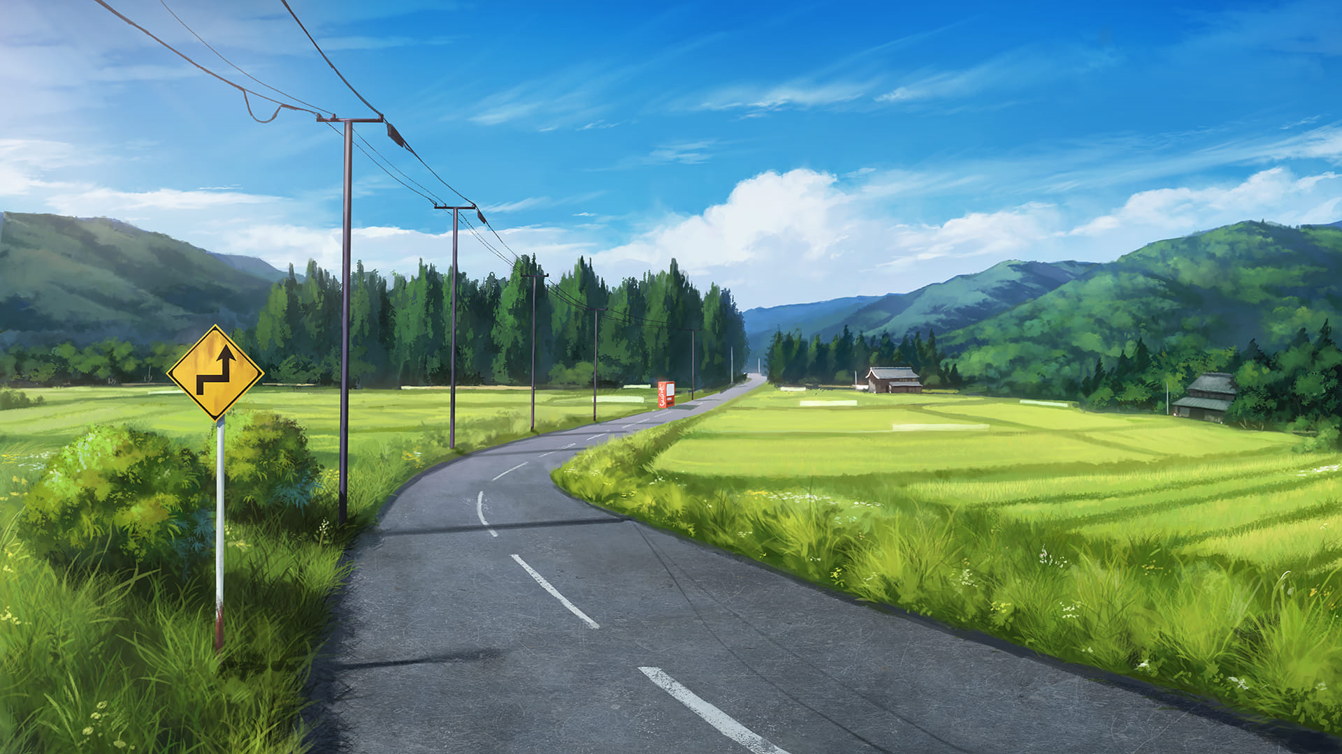Description: A painting of a rural road with a yellow sign on the side of it that says.