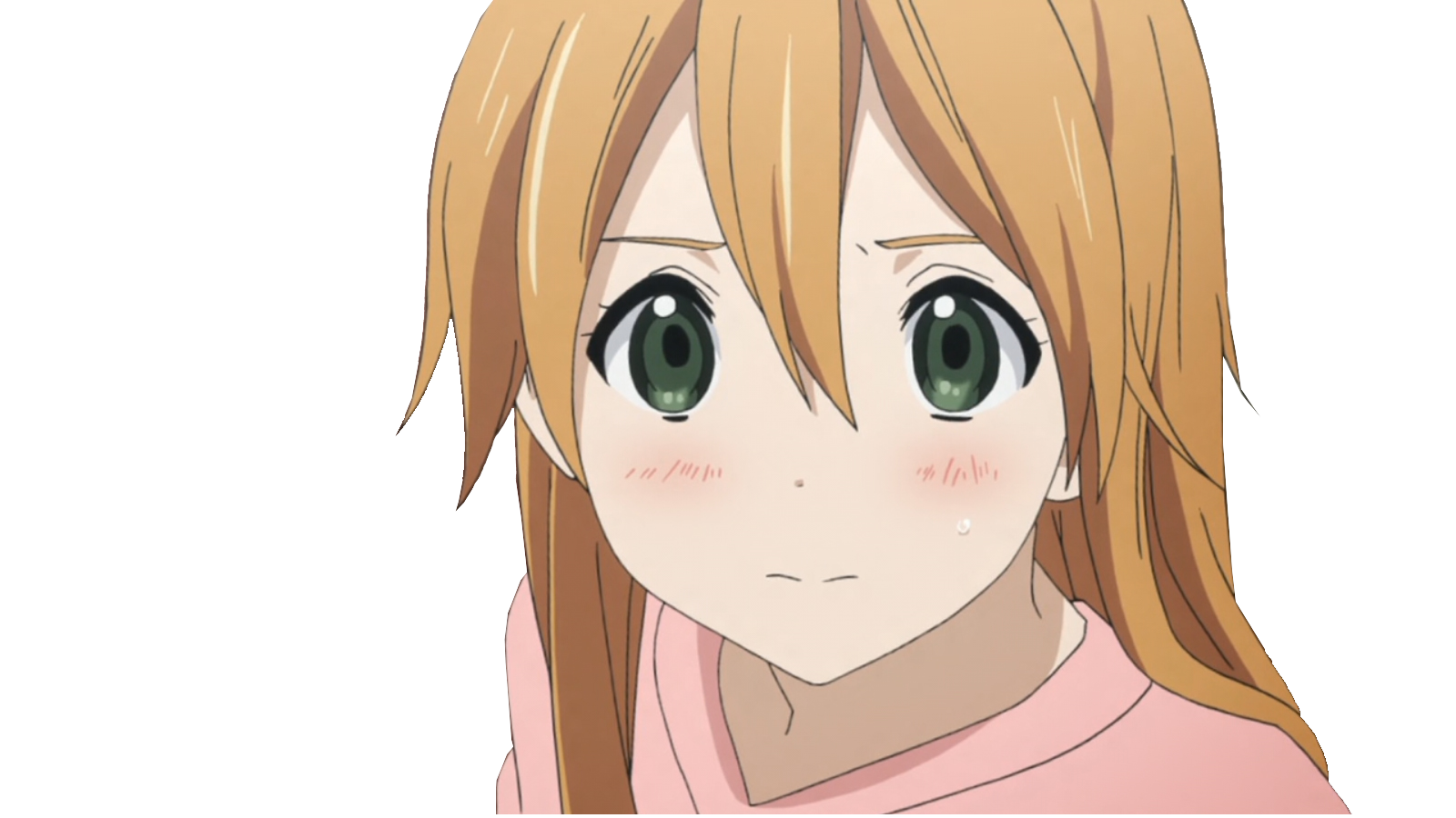 Description: A girl with long blonde hair and green eyes looking at the camera with a sad look on her face.