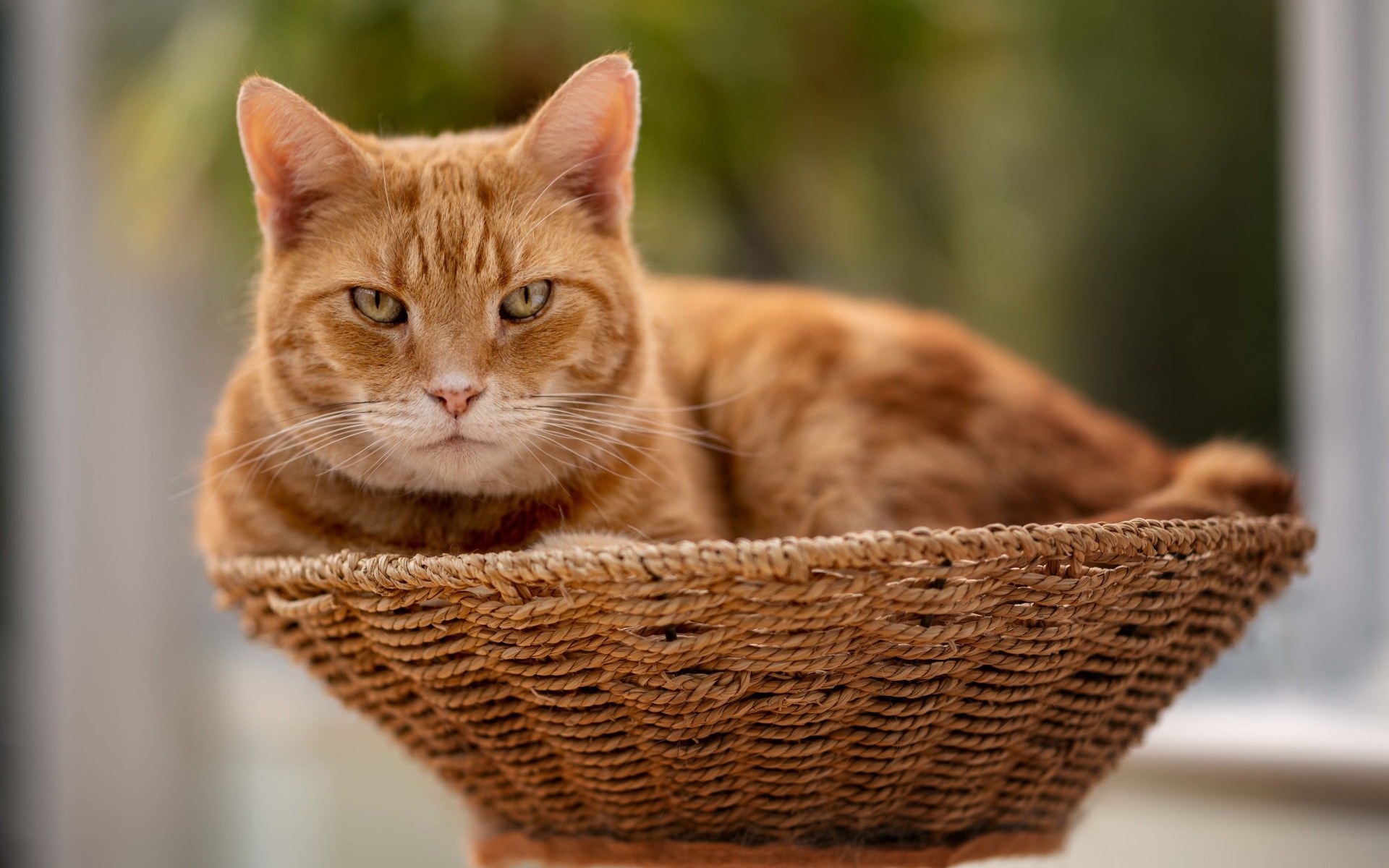 Description: A cat is sitting in a basket on a window sill looking at the camera with a sad look on its face.