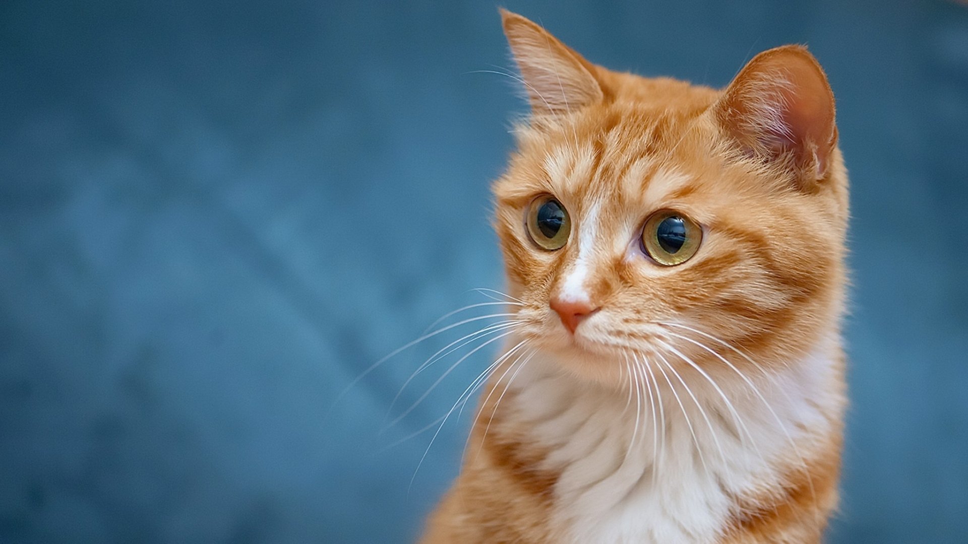 Description: A cat with a blue background looking at the camera with a sad look on its face and a serious look on its face.