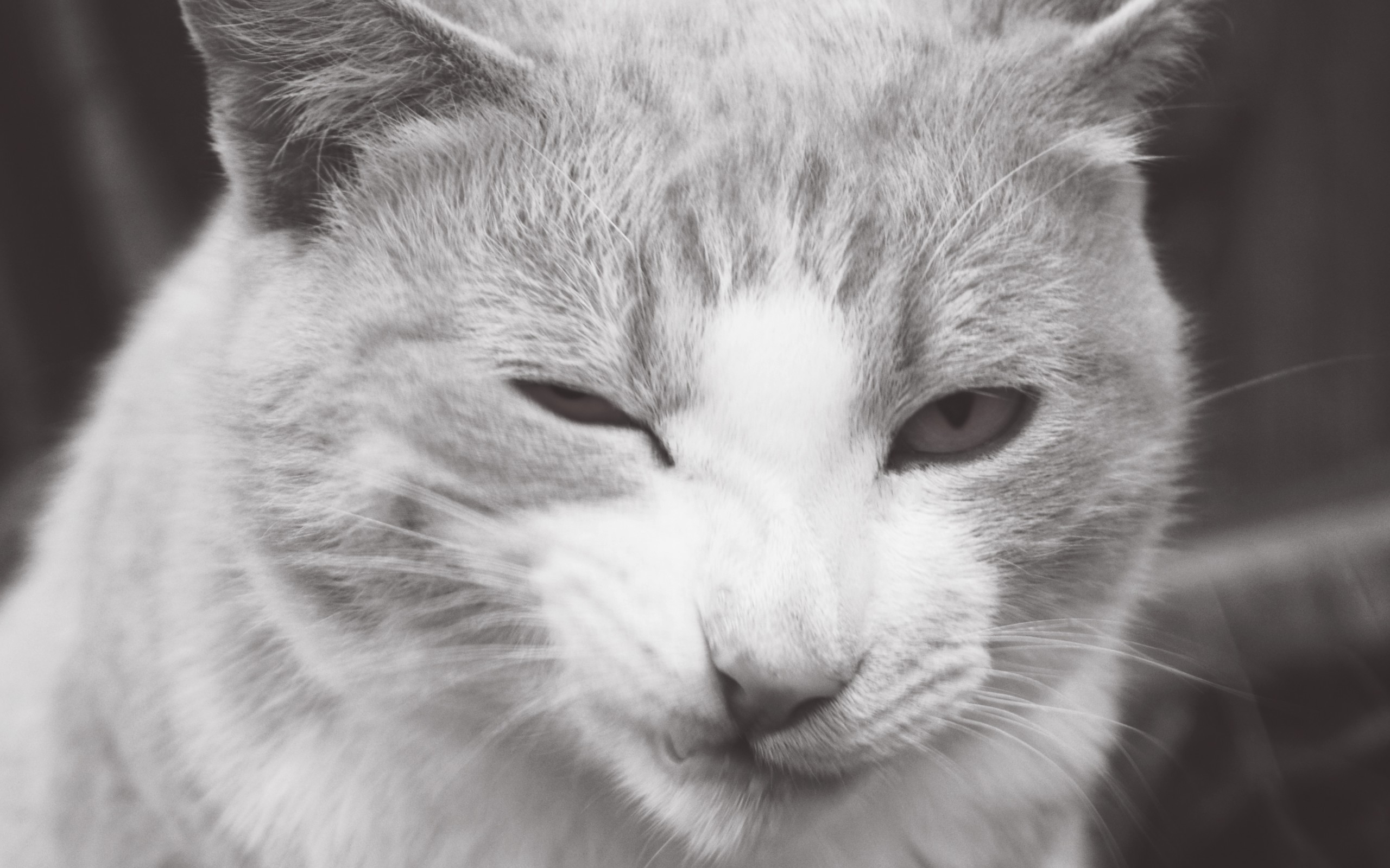 Description: A cat with a sad look on its face sitting on a chair with a black and white background and a black and white photo of it.