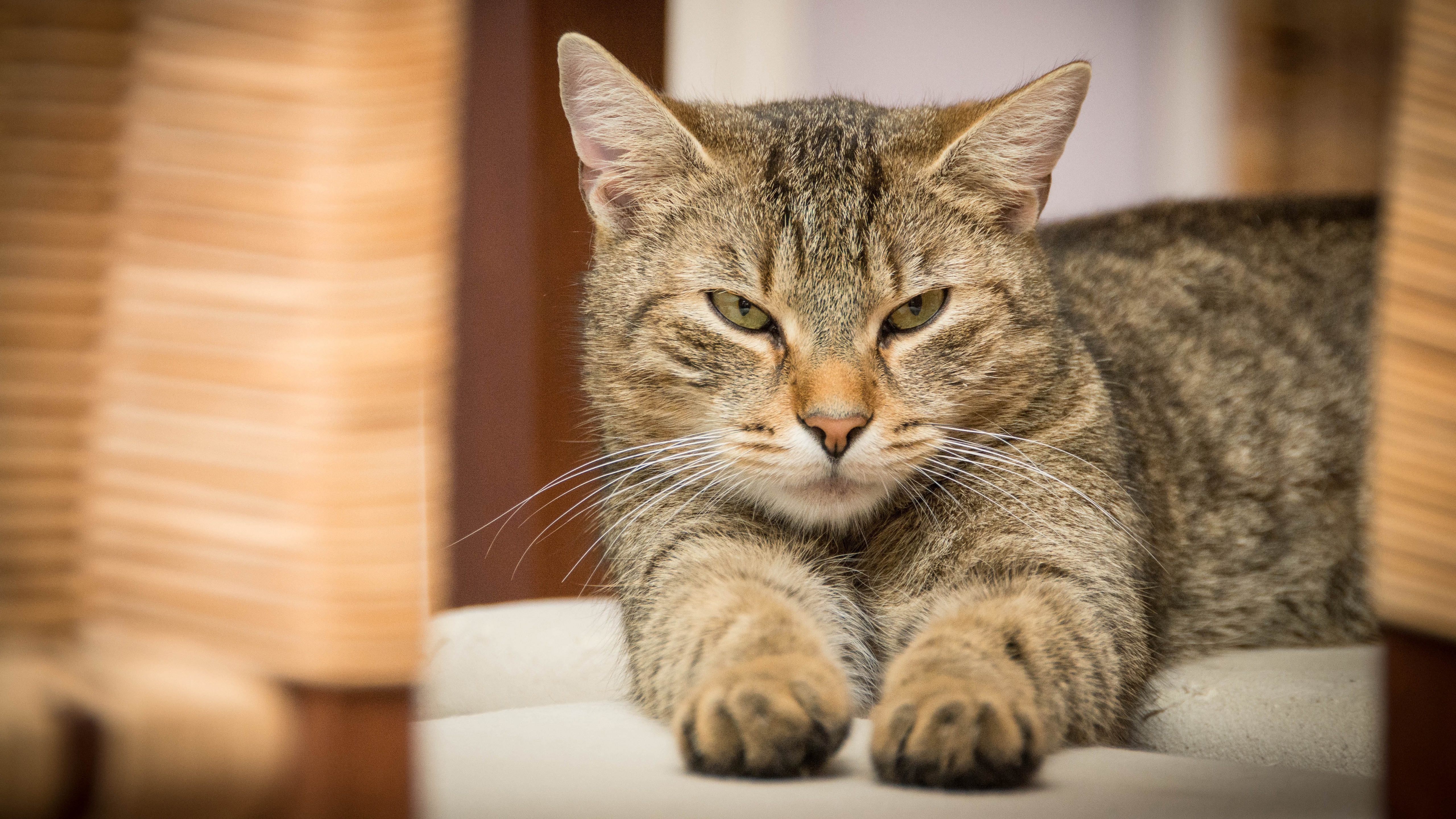 Description: A cat sitting on a chair looking at the camera with a sad look on its face and eyes.