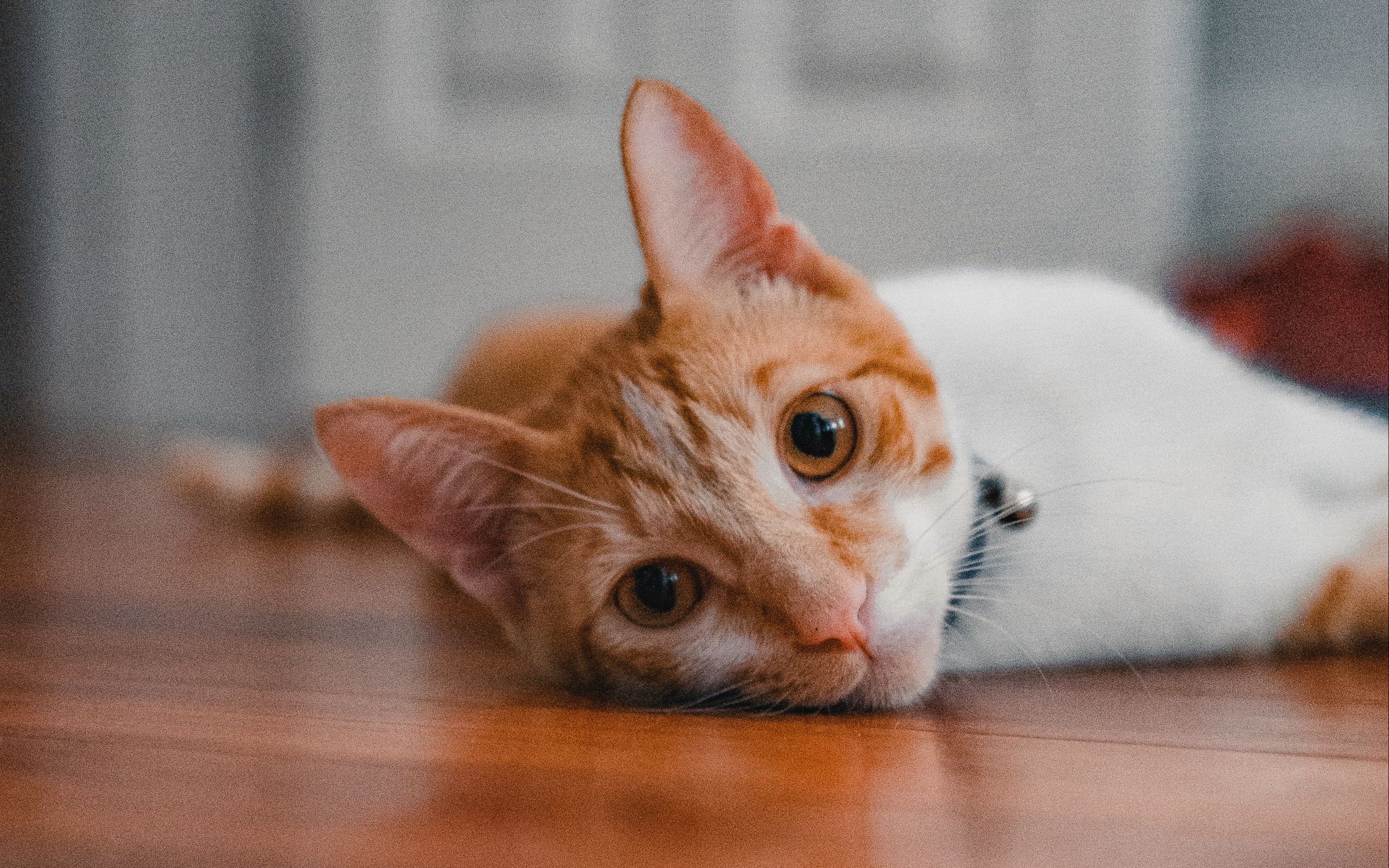 Description: A cat laying on the floor looking at the camera with a sad look on its face and eyes.