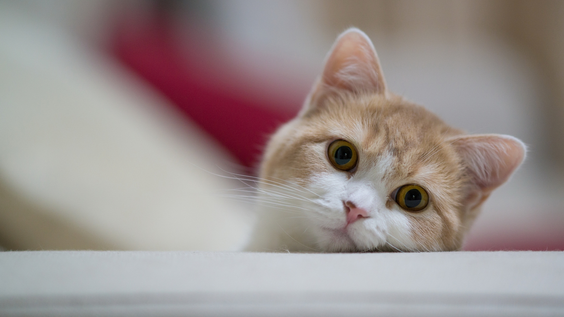 Description: A cat with a sad look on its face looking at the camera with a blurry background of a couch.
