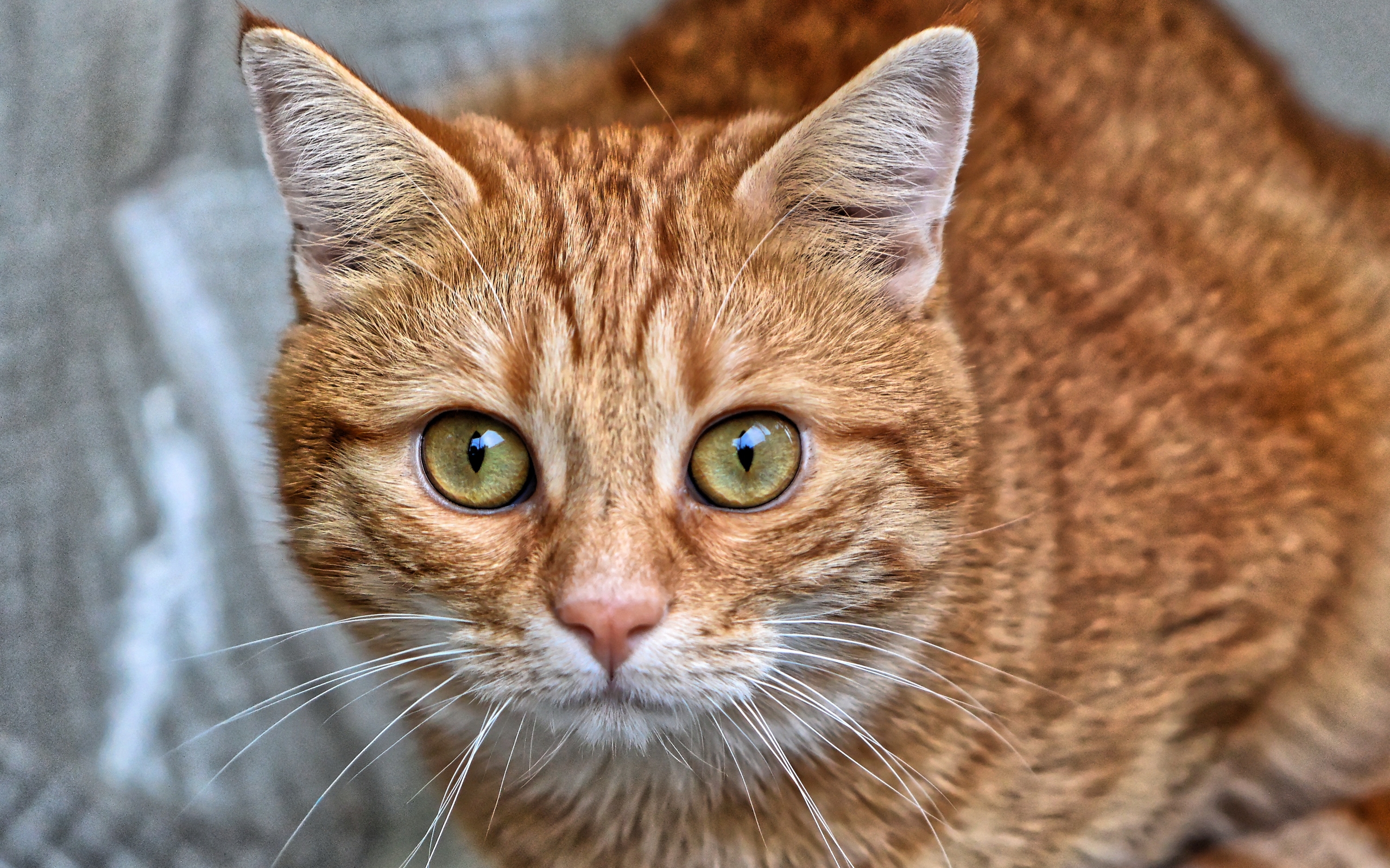 Description: A cat with green eyes sitting on a bench looking at the camera with a sad look on its face.