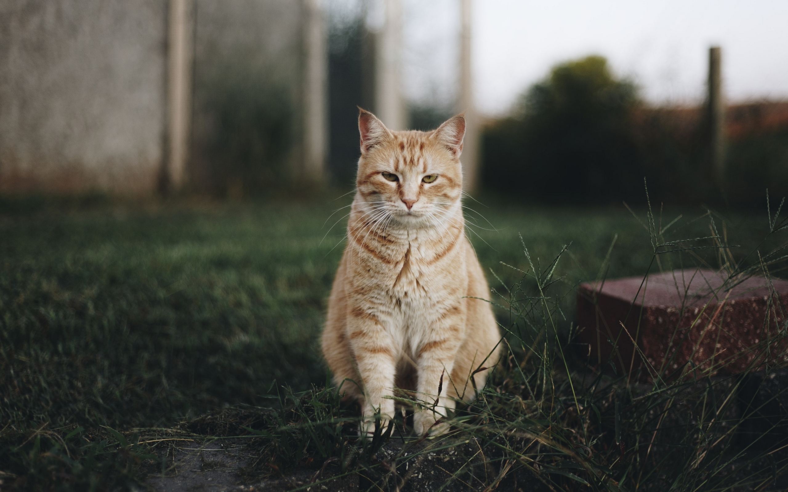 Description: A cat sitting in the grass looking at the camera with a sad look on its face and eyes.