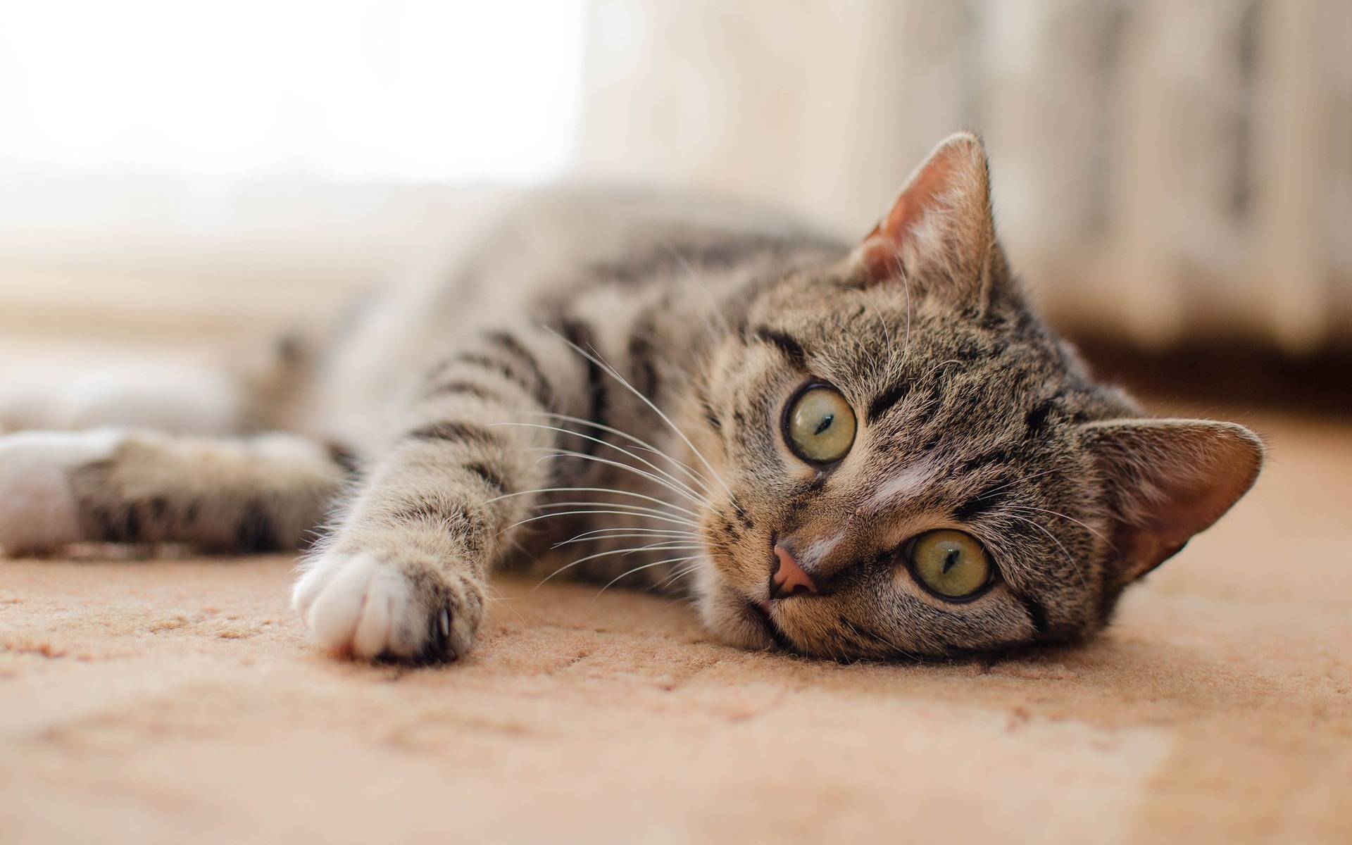 Description: A cat laying on the floor looking at the camera with a sad look on its face and eyes.
