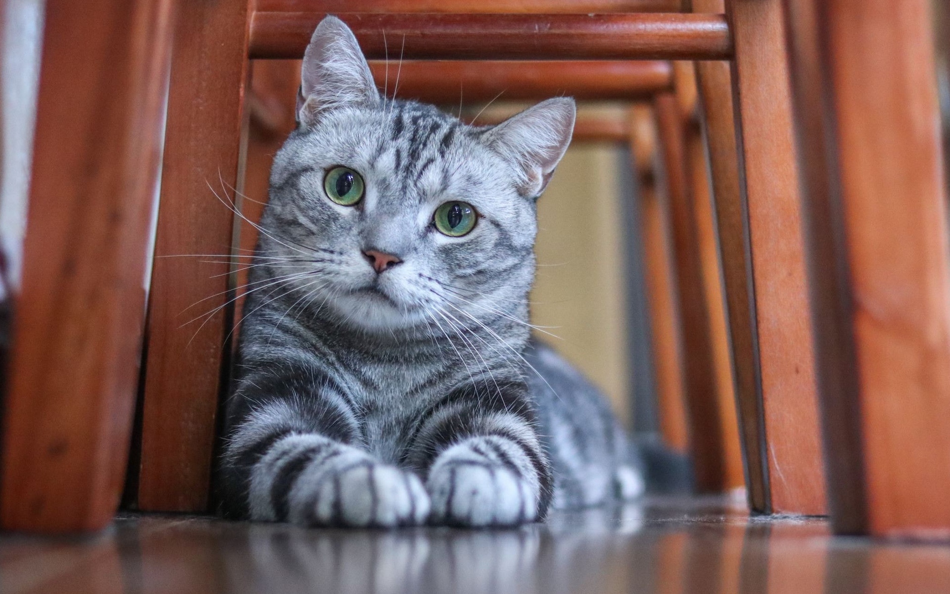 Description: A cat sitting on the floor under a chair looking up at the camera with a sad look on its face.