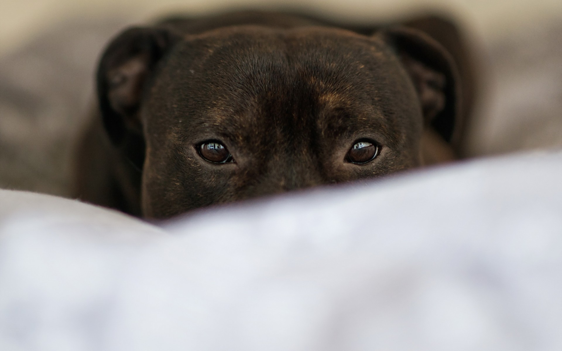 Description: A dog is laying down on a bed looking at the camera with a sad look on his face and eyes.